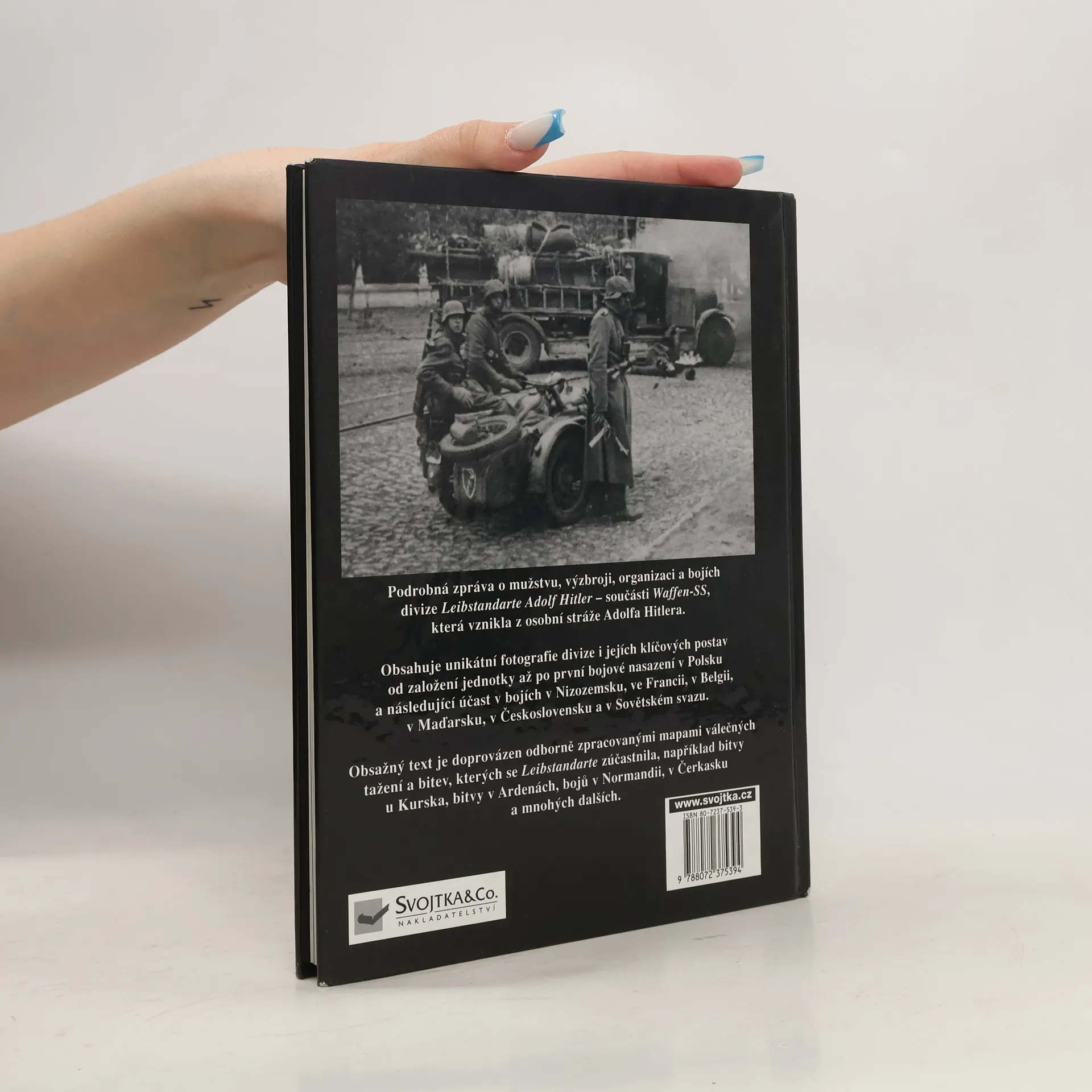 Podrobná zpráva o mužstvu, výzbroji, organizaci a bojích divize Leibstandarte Adolf Hitler - součástí Waffen-SS, která vznikla z osobní stráže Adolfa Hitlera. Obsahuje unikátní fotografie divize i jejích klíčových postav od založení jednotky až po první bojové nasazení v Polsku a následující účast v bojích v Nozizemsku, ve Francii, v Belgii, v Maďarsku, v Československu a v Sovětském svazu. Obsažný text je doprovázen odborně zpracovanými mapami válečných tažení a bitev, kterých se Leibstandarte zůčastnila, například bitvy u Kurska, bitvy v Ardenách, bojů v Normandii, v Čerkasku a mnohých dalších.