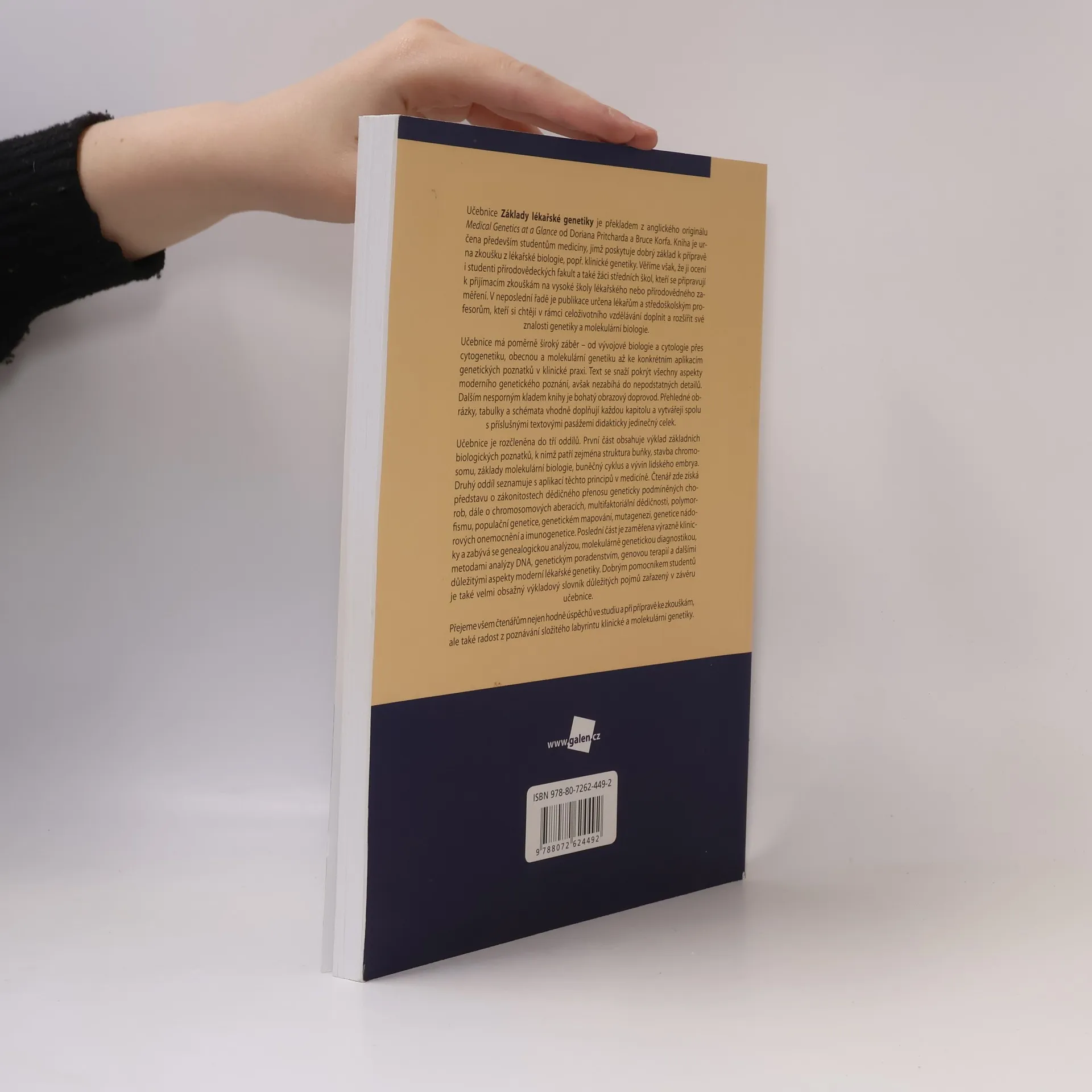 Učebnice je překladem anglického originálu Medical Genetics at a Glance a je určena především studentům medicíny, kteří se připravují na zkoušku z lékařské biologie a klinické genetiky. Využijí ji také studenti přírodovědeckých fakult a žáci středních škol, kteří se chystají na přijímací zkoušky na vysoké školy zaměřené na medicínu nebo přírodní vědy. Kniha je rovněž užitečná pro lékaře a středoškolské profesory, kteří chtějí rozšířit své znalosti genetiky a molekulární biologie v rámci celoživotního vzdělávání. Učebnice pokrývá široké spektrum témat od vývojové biologie a cytologie po cytogenetiku, obecnou a molekulární genetiku, a aplikace genetických poznatků v klinické praxi. Je rozdělena do tří oddílů: první část se zaměřuje na základní biologické poznatky, jako je struktura buňky a vývin lidského embrya. Druhý oddíl se věnuje aplikaci těchto principů v medicíně, včetně dědičných chorob a genetického mapování. Poslední část se soustředí na klinické aspekty, jako je molekulárně genetická diagnostika a genová terapie. Na závěr je zařazen podrobný výkladový slovník důležitých pojmů. Bohatý obrazový doprovod v každé kapitole zajišťuje didaktickou hodnotu učebnice.