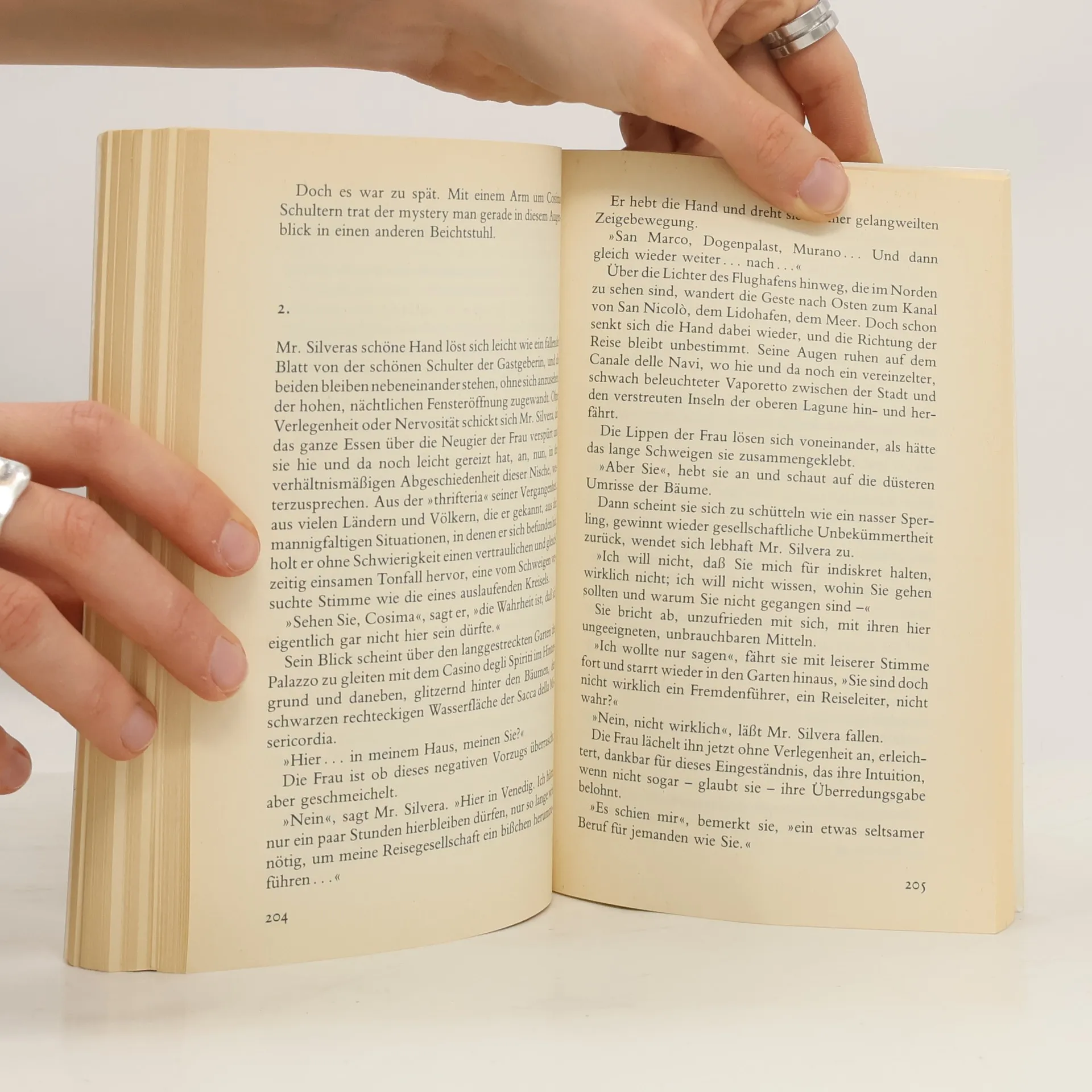 Für alle, die ihren Urlaub noch vor sich haben, ist ein Buch eine ideale Begleitung, besonders wenn man nach Venedig reist. Die Hauptfigur, Mr. Silvera, ist ein geheimnisvoller Mann um die 40, groß und mager, mit einem schwer deutbaren Lächeln und einer bemerkenswerten Antwort auf schwierige Fragen – "ah". Er ist kein typischer Reisebegleiter und lässt geduldig die Begeisterung der Touristen über sich ergehen. Während er Venedig kennt, trennt er klar zwischen dem touristischen und dem ihm vertrauten Teil der Stadt. Mr. Silvera spricht fließend Suaheli und Chinesisch, erinnert sich an nicht mehr existierende Fresken und identifiziert einen Fugger auf einem Gemälde, als hätte er ihn gekannt. Seine Komplexität macht es schwer, sich in ihn zu verlieben, was zu Schwierigkeiten führt. Obwohl man den beiden ihr Glück in der romantischen Kulisse Venedigs gönnen möchte, lässt Mr. Silveras Leben dies nicht zu. Die Autoren erkunden verschiedene Möglichkeiten seiner Figur, ohne auf einfache Lösungen zurückzugreifen. Ihr Ziel war es, das alte Venedig sichtbar zu machen, und das gelingt ihnen eindrucksvoll. Die Lektüre ist so fesselnd, dass man sich wünscht, sie möge nie enden. Am Ende bleibt unklar, ob es sich um einen Krimi oder eine melancholische Liebesgeschichte handelt, doch die Reflexion über das Phänomen der Zeit bietet reichlich Denkanstöße.