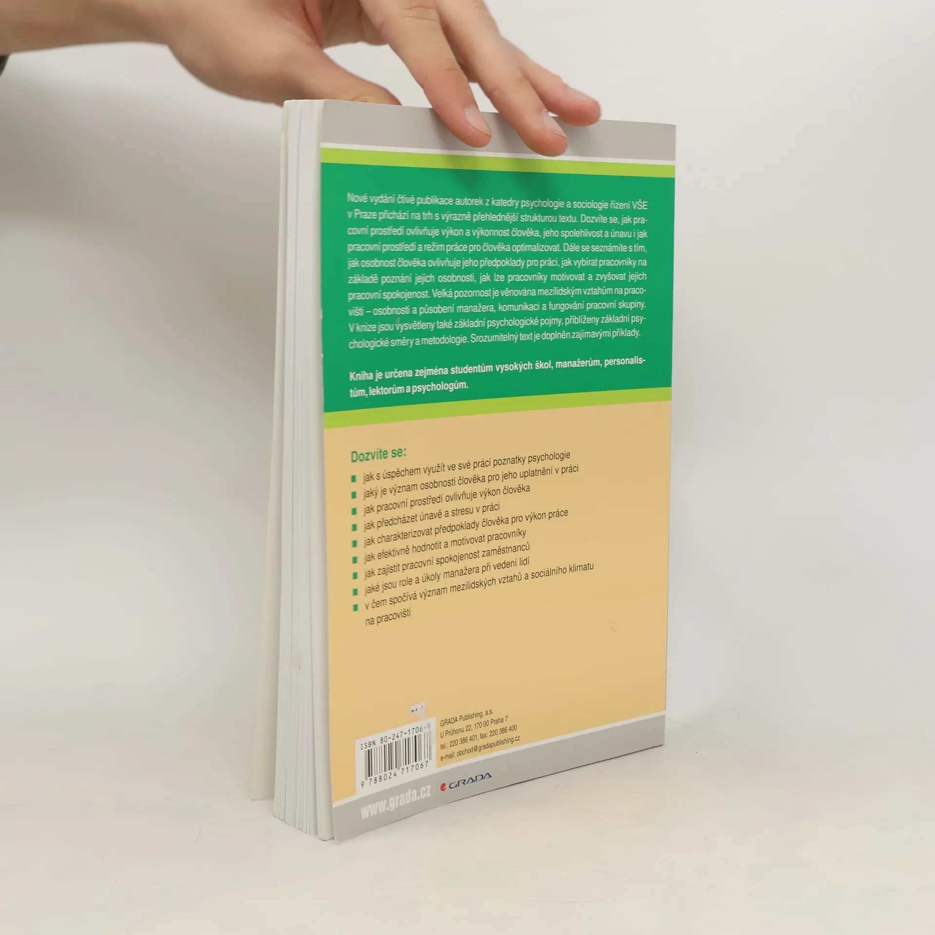 Zcela přepracované a aktualizované vydání čtivé publikace z pera autorek z katedry psychologie a sociologie řízení VŠE v Praze přichází na trh se novou, výrazně přehlednější strukturou textu. Dozvíte se, jak pracovní prostředí ovlivňuje výkon a výkonnost člověka, jeho spolehlivost a únavu i jak pracovní prostředí a režim práce pro člověka optimalizovat. Dále se seznámíte s tím, jak osobnost člověka ovlivňuje jeho předpoklady pro práci, jak vybírat pracovníky na základě poznání jejich osobnosti a mnoho dalšího.