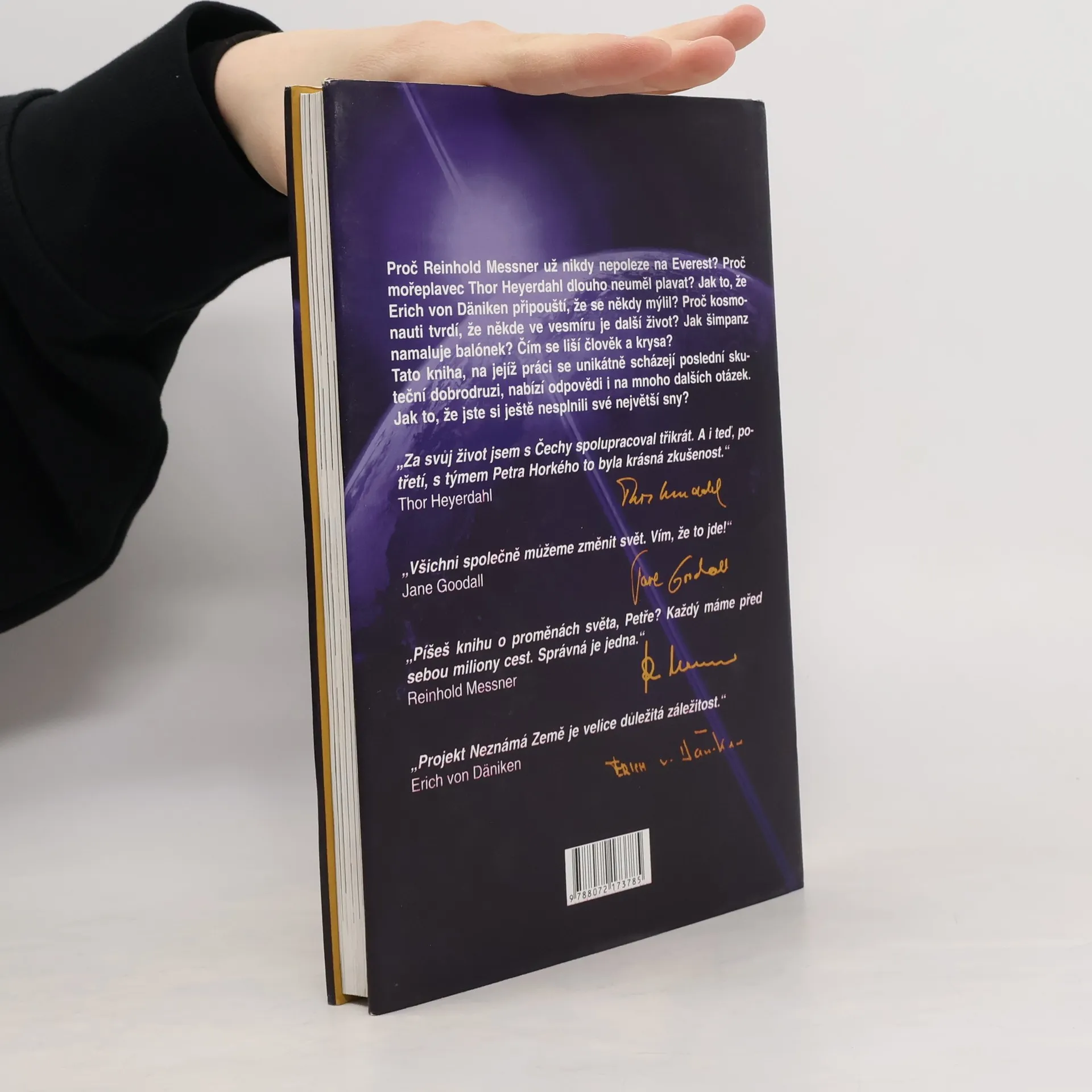 Dokáže jeden člověk během svého života změnit svět? A jak se naopak změní svět během života jednoho člověka? Tyto otázky stály na počátku cyklu cestopisných dokumentů Neznámá Země. Sedm let natáčení na všech obydlených kontinentech se promítlo v jedenadvaceti dílech televizního seriálu a nyní také v této knize, která obsahuje dosud nepoužité rozhovory a příběhy. Autor získal výpovědi posledních opravdových cestovatelů a osobností, které posunují hranice různých oborů. V knize se setkávají cestovatel Thor Heyerdahl, horolezec Reinhold Messner, spisovatelé Erich von Däniken a Arthur C. Clarke, znalec moře Jean-Michel Cousteau, první přemožitel Everestu Edmund Hillary a astronauté z Ruska, USA, Česka a Slovenska. Kniha nastiňuje životní příběhy největších cestovatelů novověku, kteří překračovali hranice možného, a nabízí obraz světa viděný očima dobrodruhů přelomu 20. a 21. století. Přináší fascinující osudy a kuriózní historky Messnera, Heyerdahla, Hillaryho a jejich kolegů, ale také cenné postřehy a názory obyčejných lidí ze všech koutů světa, kteří polemizují se slavnými „světoobčany“. Kniha plná nevšedních rozhovorů a zážitků čtenáře přenáší na různá místa světa a shrnuje, co mají lidé společného a jaká je vlastně „Neznámá země“ každého z nás.