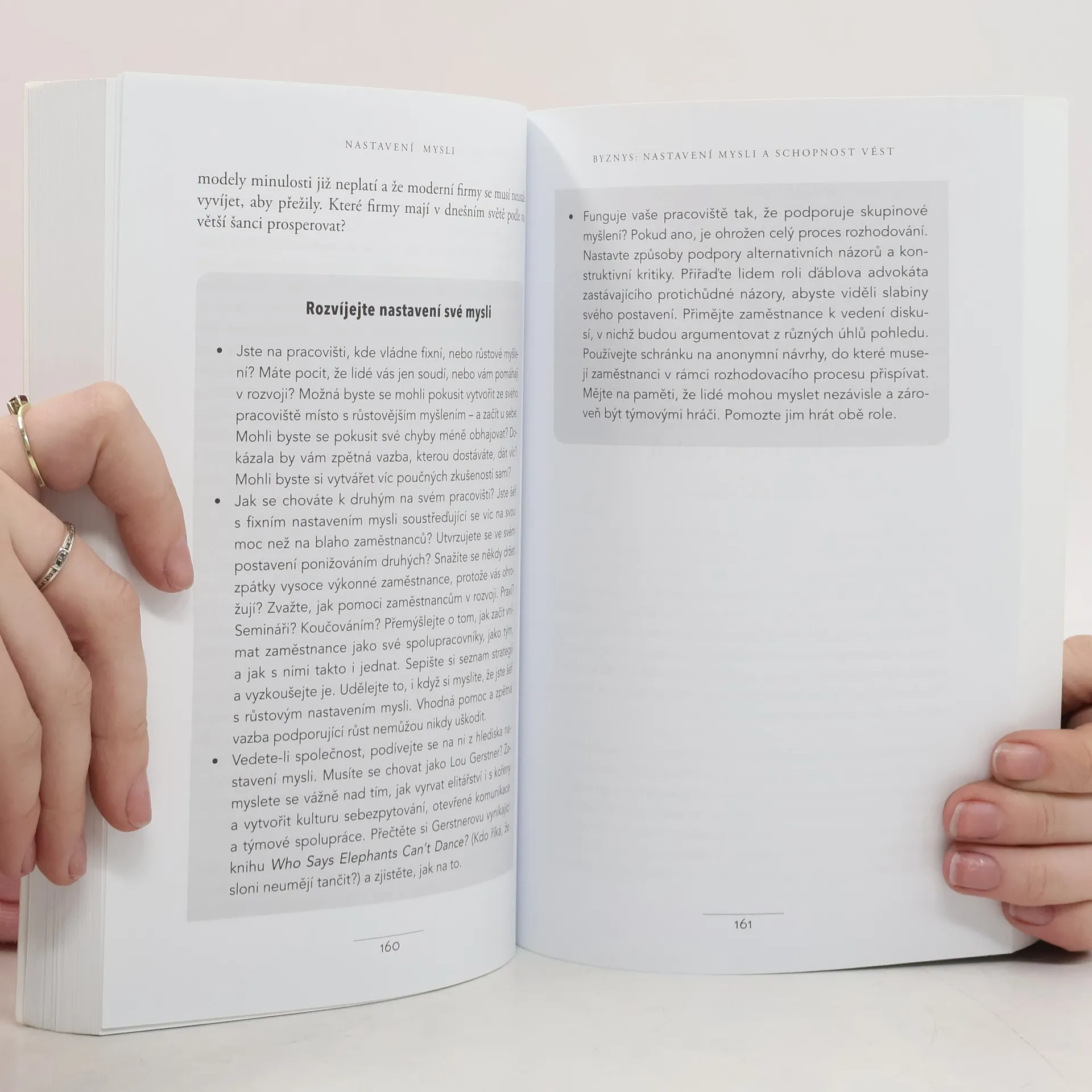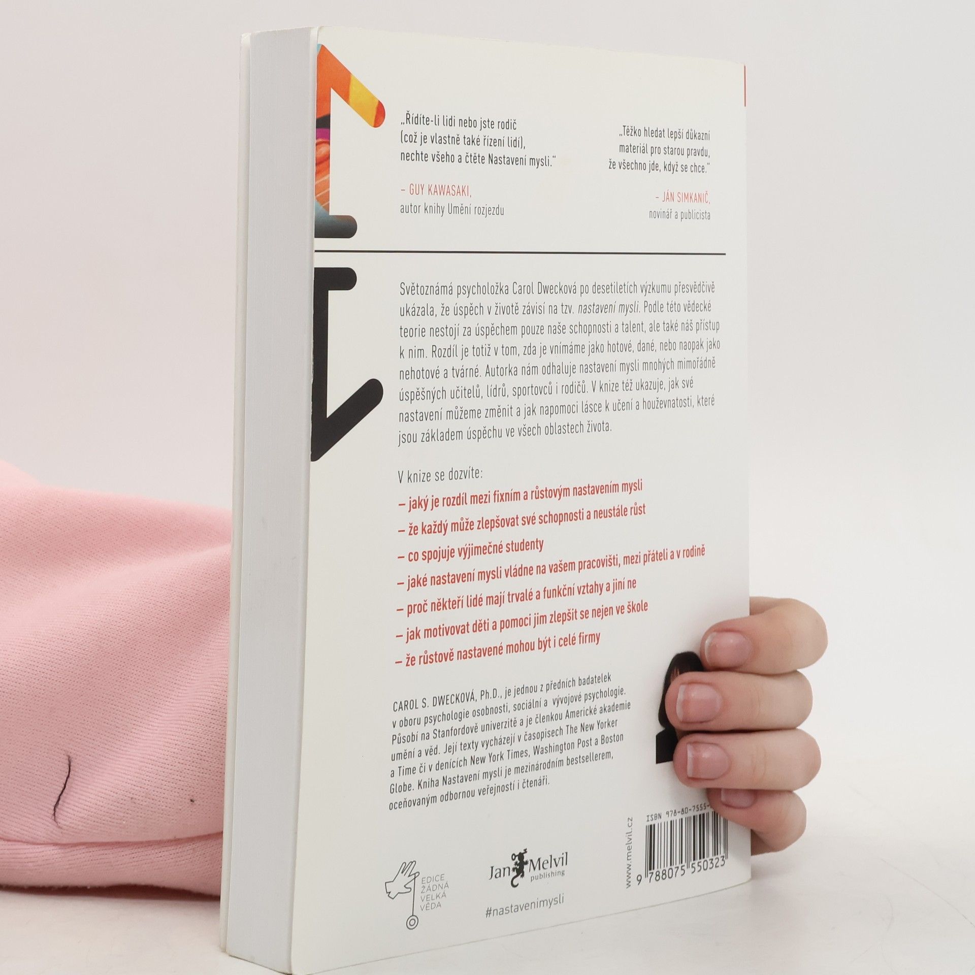 Jednoduchá myšlenka, kolem níž se tato kniha točí, a za níž stojí desítky let vědeckého výzkumu, se dá vyjádřit zhruba takto: úspěch máme ve svých hlavách. Profesorka Dwecková se svým týmem na Standfordské univerzitě zjistila, že svou přirozeností tíhneme ke dvěma relativně vyhraněným způsobům myšlení o sobě a své úspěšnosti: k myšlení růstovému a myšlení fixnímu (angl. „growth mindset“ a „fixed mindset“). To, které myšlení u nás převládá, pak významně ovlivňuje naši reálnou úspěšnost. Ke zjištěním Dweckové popsaným v knize patří nadějný závěr, že se navzdory své dispozici dokážeme během života změnit, a autorka ukazuje, jak na to: jak využít svůj plný potenciál. Chcete vědět, jak přesně se dva zmíněné typy myšlení projevují? Typickým rysem fixního myšlení je vzdávání se před překážkou, neschopnost přijímat zpětnou vazbu, špatný pocit při vnímání úspěchu ostatních, vyhýbání se výzvám a negativní postoj k úsilí jako takovému. Naopak růstové myšlení se projevuje vřelým vztahem k výzvám, vytrvalostí při čelení překážkám, pozitivním vztahem ke kritice. Růstově myslící člověk vnímá úsilí jako cestu k mistrovství a v úspěchu druhých vidí inspiraci.