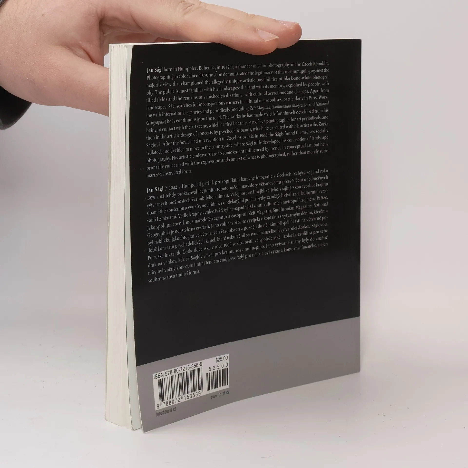 32. svazek edice Fototorst. Jan Ságl (*1942 v Humpolci) patří k průkopníkům barevné fotografie v Čechách. Zabývá se jí od roku 1979 a už tehdy prokazoval legitimitu tohoto média navzdory většinovému přesvědčení o jedinečných výtvarných možnostech černobílého snímku. Veřejnost zná nejblíže jeho krajinářskou tvorbu: krajinu s pamětí, zkoušenou a využívanou lidmi, s obdělanými poli i zbytky zaniklých civilizací, kulturními památkami i změnami. Vedle krajiny vyhledává Ságl nenápadná zákoutí kulturních metropolí, zejména Paříže. Jako spolupracovník mezinárodních agentur a časopisů je neustále na cestách. Jeho volná tvorba se vyvíjela v kontaktu s výtvarným děním, kterého byl zprvu účasten jako fotograf ve výtvarných časopisech a později do něj sám přispěl účastí na výtvarné podobě koncertů psychedelických kapel, které uskutečnil se svou manželkou, výtvarnicí Zorkou Ságlovou.