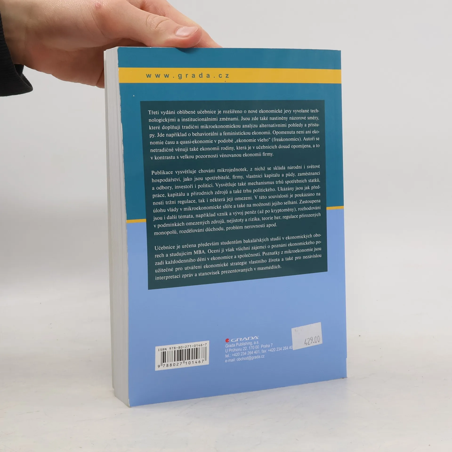 Třetí vydání oblíbené učebnice přináší rozšíření o nové ekonomické jevy, které vznikly v důsledku technologických a institucionálních změn. Kromě tradiční mikroekonomické analýzy se zaměřuje na alternativní pohledy, jako jsou behaviorální a feministická ekonomie, ekonomie času a quasi-ekonomie, včetně "ekonomie všeho" (freakonomics). Autoři se také věnují ekonomii rodiny, která byla dosud opomíjena, v kontrastu s důrazem na ekonomii firmy. Publikace objasňuje chování mikrojednotek, jako jsou spotřebitelé, firmy, vlastníci kapitálu a půdy, zaměstnanci, investoři a politici. Vysvětluje mechanismy trhů spotřebních statků, práce, kapitálu a přírodních zdrojů, včetně trhu politického. Zmiňuje přednosti a omezení tržní regulace a roli vlády v mikroekonomice, včetně potenciálních selhání. Dále se věnuje tématům jako vznik a vývoj peněz, rozhodování v podmínkách omezených zdrojů, teorie her, regulace přirozených monopolů a problém nerovnosti. Učebnice je určena především studentům bakalářských studií v ekonomických oborech a studujícím MBA, ale ocení ji i ti, kteří chtějí porozumět ekonomickému pozadí každodenního dění. Poznatky z mikroekonomie jsou užitečné pro utváření ekonomické strategie vlastního života a pro nezávislou interpretaci zpráv v masmédiích.