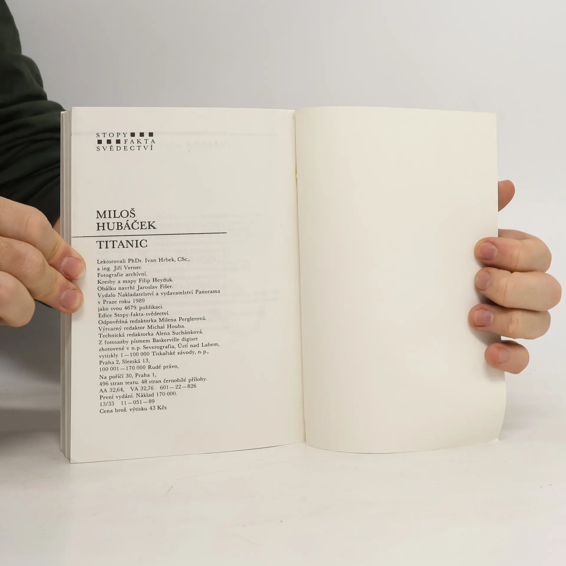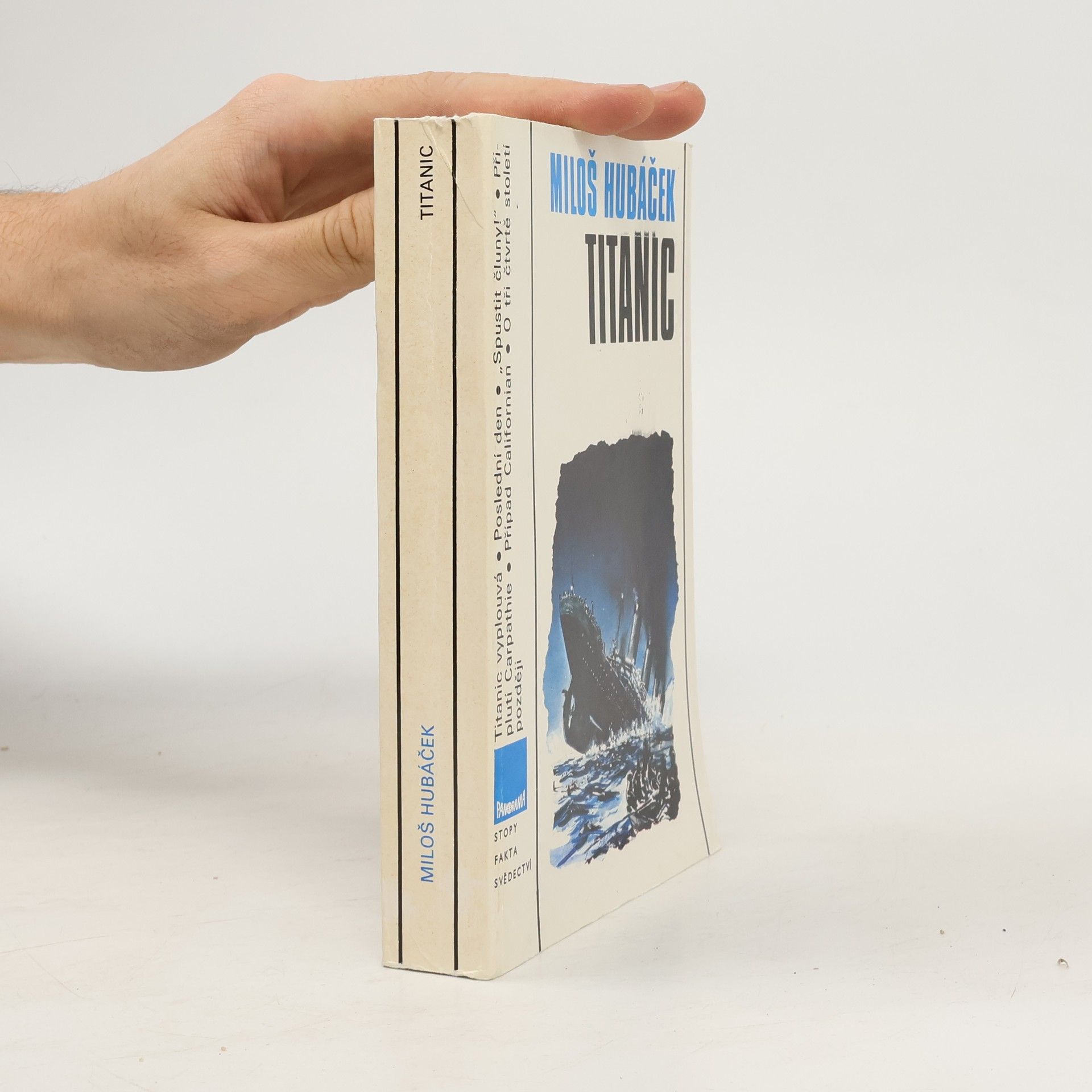 Titanic byl největší lodí světa své doby, měl to být triumf lidského génia a průmyslového věku. Byl též výrazem soupeření transoceánských společností, které se předháněly ve svých nabídkách. Loď dlouhá téměř 260 metrů měla pojmout až tři tisíce pasažerů, bylo to něco dosudnevídaného. 10. dubna 1912 vyplul ze Southamptonu na pravidelné lince do New Yorku, aby se představil v plné kráse všem lidem i mořským vlnám. Nikdo s nadšených a řádně hrdých pasažérů a členů posádky netušil, že je to také jeho poslední plavba. Co se odehrávalo na palubě, v podpalubích, na kapitánském můstku během oněch osudových chvil? 1. vydání. Edice: Stopy, fakta, svědectví Kresby a mp. Filip Heyduk. Obálka Jaroslav Fišer.