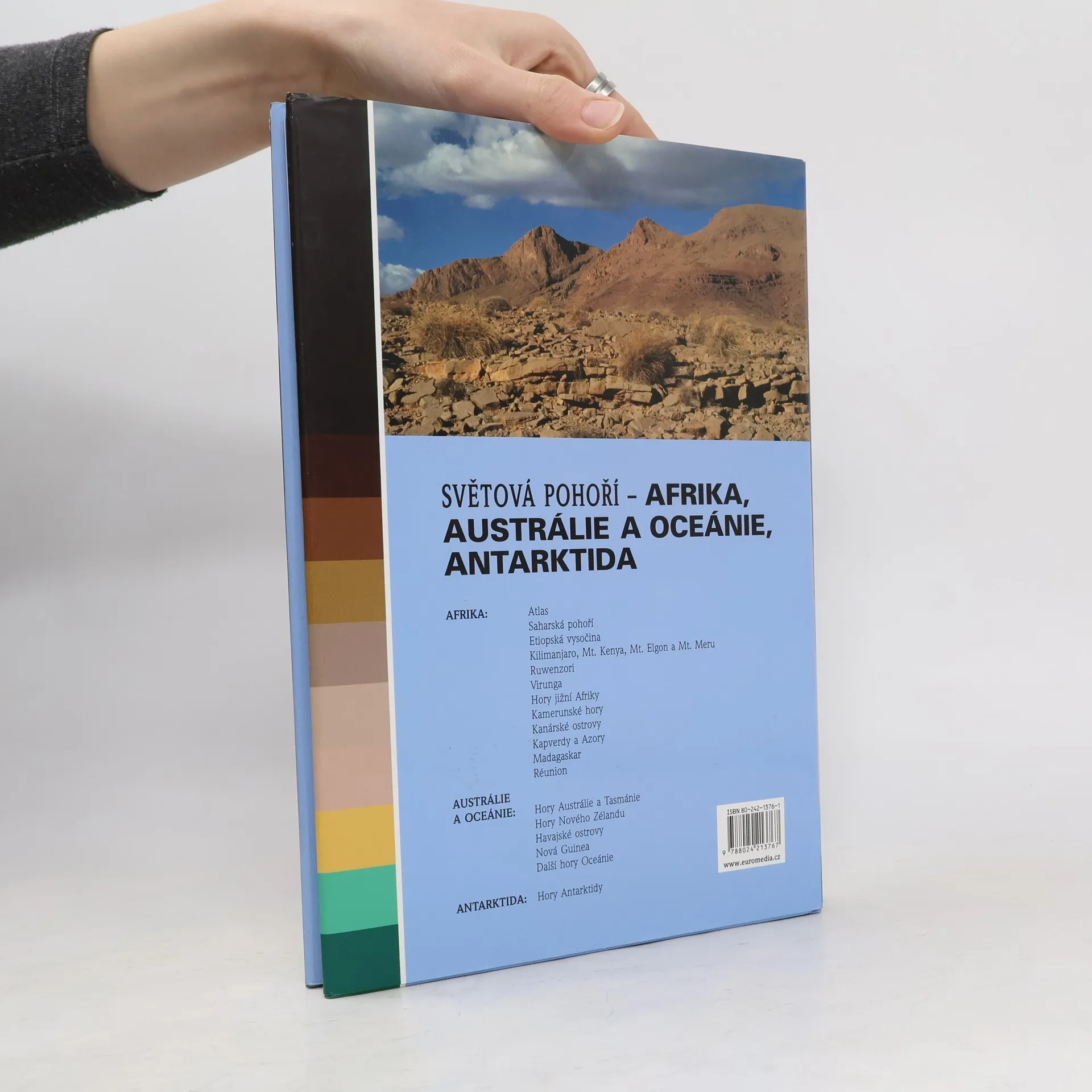 V tomto svazku, který uzavírá čtyřdílný komplet s titulem Světová pohoří, se věnuje hlavním pohořím v Africe, Austrálii a Oceánii a také horám Antarktidy. Na 200 stranách knihy autoři představují pohoří s jejich členěním, geologickým složením, klimatickými podmínkami, vodní poměry (ledovce, řeky, jezera, gejzíry, vodopády atd.), upozorňuje na živou přírodu v jednotlivých výškových stupních, mapuje osídlení v podhůří i na méně přístupných místech vysoko v horách a přináší souhrnné informace o aktuálních možnostech turistiky a cestování do jednotlivých oblastí. Ty nyní stále stoupají v oblibě.