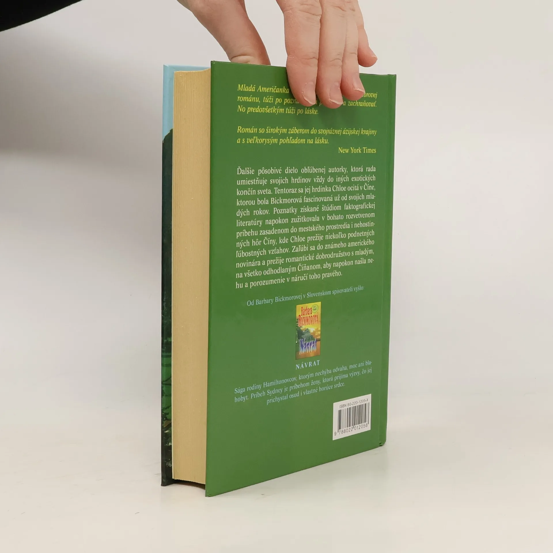 Ďalšie pôsobivé dielo obľúbenej autorky, ktorá rada umiestňuje svojich hrdinov vždy do iných exotických končín sveta. Tentoraz sa jej hrdinka Chloe ocitá v Číne, ktorou bola Bickmorová fascinovaná už od svojich mladých rokov. Poznatky získané štúdiom faktografickej literatúry napokon zúžitkovala v bohato rozvetvenom príbehu zasadenom do mestkého prostredia i nehostinných hôr Číny, kde Chloe prežije niekoľko podnetných ľúbostných vzťahov. Zaľúbi sa do známeho amerického novinára a prežije romantické dobrodružstvo s mladým, na všetko odhodlaným Číňanom, aby napokon našla nehu a porozumenie v náručí toho pravého.