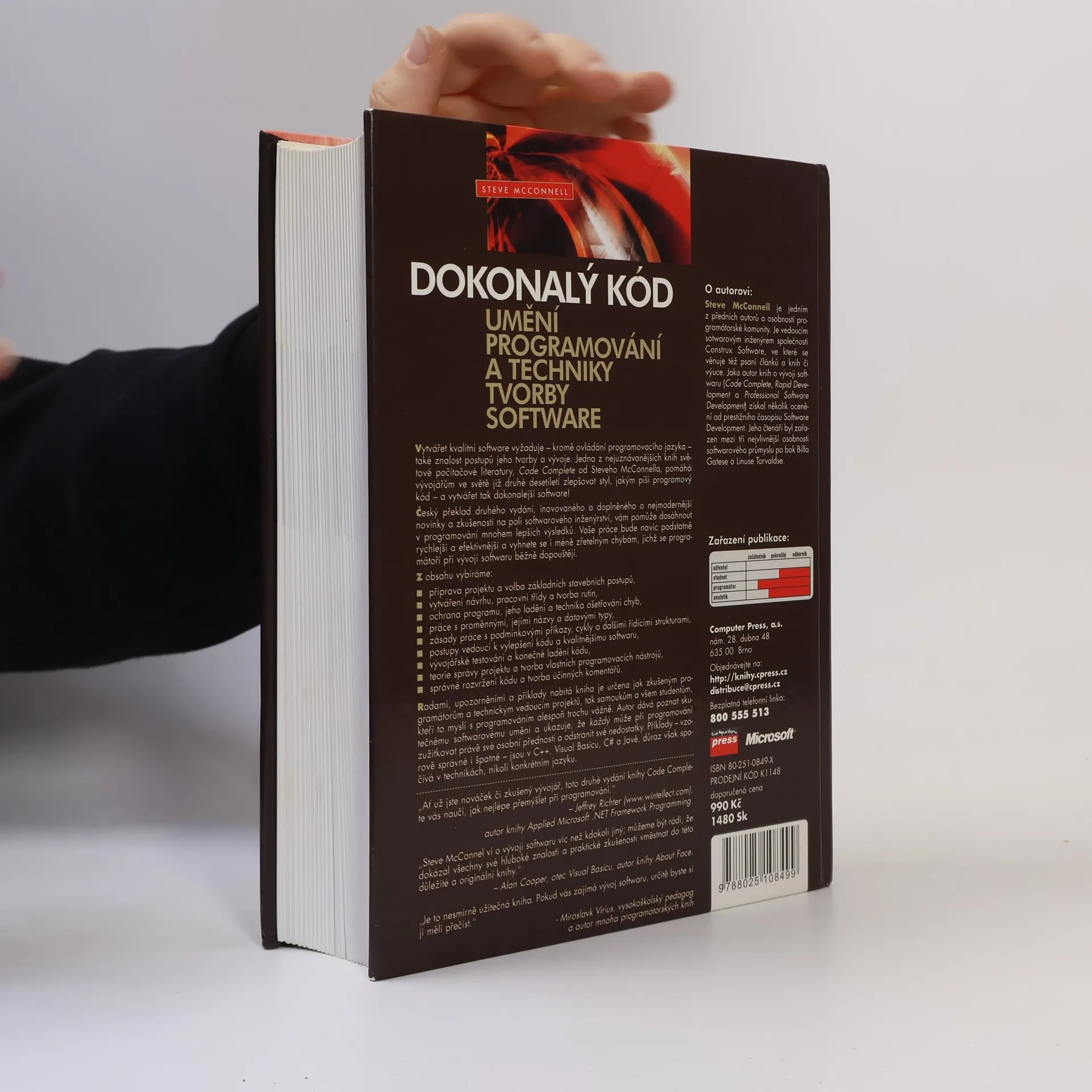 Legendární kniha Code Complete v češtině! Jeden z největších světových bestsellerů počítačové literatury. Kniha, která z vás udělá lepšího programátora! Vytvářet kvalitní software vyžaduje mimo jiné znalost postupů jeho tvorby a vývoje. Jedna z nejuznávanějších knih světové počítačové literatury, Code Complete od Steveho McConnella, pomáhá vývojářům ve světě již druhé desetiletí zlepšovat styl, jakým píší programový kód – a vytvářet tak dokonalejší software! Český překlad druhého vydání, inovovaného a doplněného o nejmodernější novinky a zkušenosti na poli tvorby software vám pomůže dosáhnout v programování lepších výsledků. Vaše práce bude navíc rychlejší a efektivnější, a vyhnete se spoustě běžných i méně zřetelných chyb, jichž se programátoři při vývoji softwaru dopouštějí.