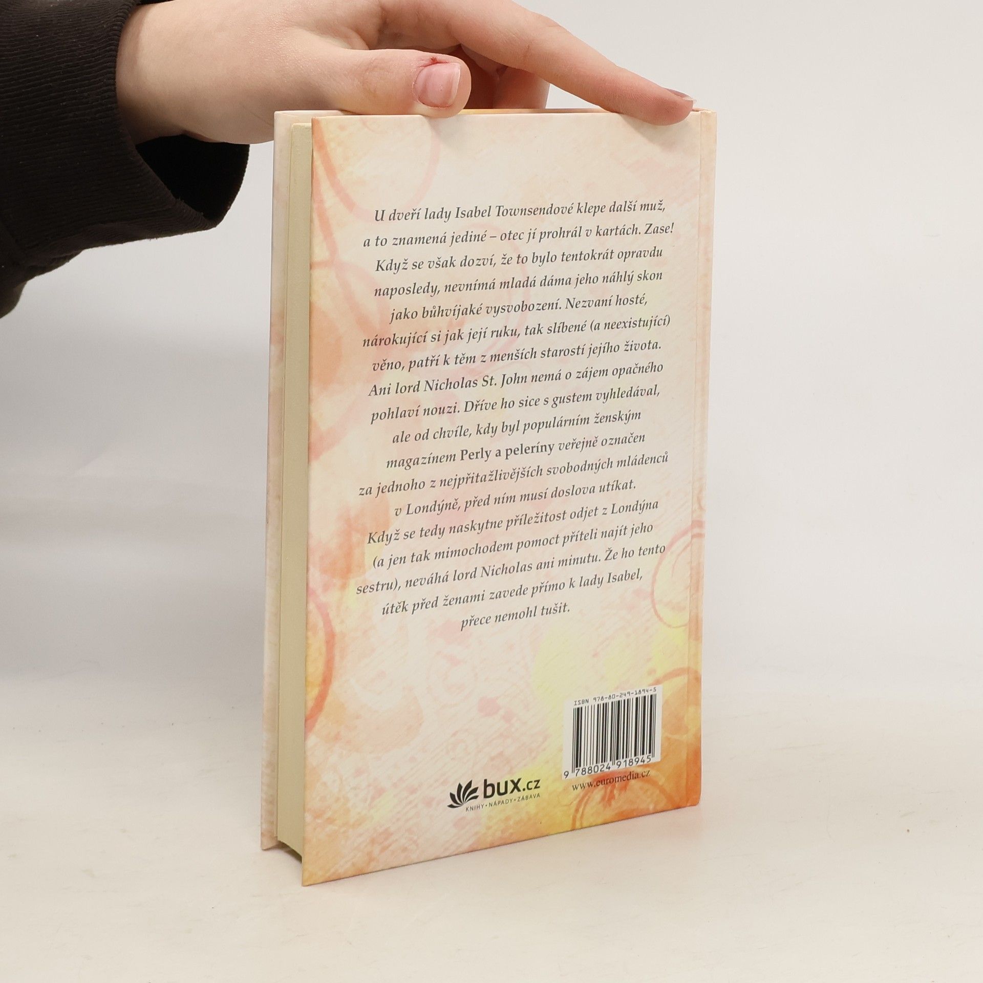 U dveří lady Isabel Townsendové klepe další muž, a to znamená jediné – otec jí prohrál v kartách. Zase! Když se však dozví, že to bylo naposledy, nevnímá lady Isabel jeho náhlou smrt jako bůhvíjaké vysvobození – pravidelné návštěvy rozdychtěných domnělých snoubenců, nárokujících si jak její ruku, tak neexistující věno, patří k těm z menších starostí jejího života. Ani lord Nicholas St. John nemá o zájem opačného pohlaví nouzi. Dříve ho snad i sám iniciativně vyhledával, ale od chvíle, co ho populární ženský magazín Perly a peleríny veřejně označil za jednoho z nejpřitažlivějších svobodných mládenců v Londýně, před ním musí doslova utíkat. Když se tedy naskytne příležitost odjet z Londýna (a jen tak mimochodem pomoct příteli najít jeho sestru), neváhá lord Nicholas ani minutu. Že ho tento útěk před ženami – tedy pardon, pátrání – osudově zavede přímo k lady Isabel, přece nemohl tušit. Druhý titul z úspěšné série historických romancí z Anglie první poloviny 19. století.