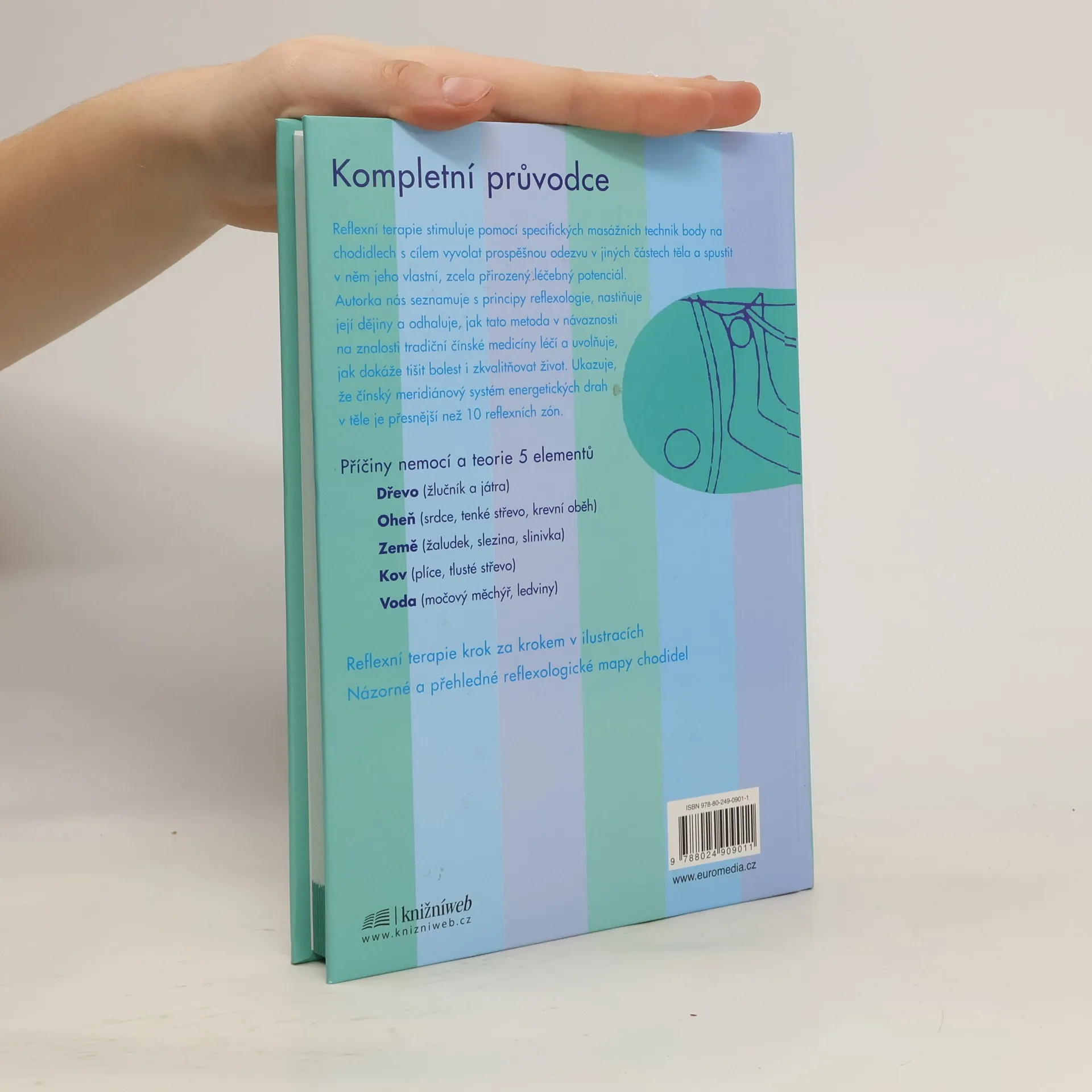 Reflexní terapie krok za krokem v ilustracích, názorné a přehledné reflexologické mapy chodidel. Reflexní terapie stimuluje pomocí specifických masážních technik body na chodidlech s cílem vyvolat prospěšnou odezvu v jiných částech těla a spustit v něm jeho vlastní, zcela přirozený léčebný potenciál. Autorka nás seznamuje s principy reflexologie, nastiňuje její dějiny a odhaluje, jak tato metoda v návaznosti na znalost tradiční čínské medicíny léčí a uvolňuje, jak dokáže tišit bolest i zkvalitňovat život. Ukazuje, že čínský meridiánový systém energetických drah v těle je přesnější než 10 reflexních zón.