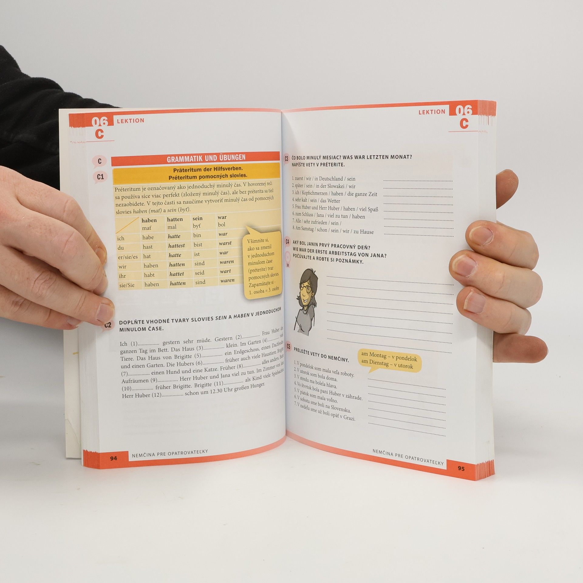 Nemčina pre opatrovateľky je určená pre ľudí, pracujúcich v rakúskych alebo nemeckých rodinách ako opatrovateľky či opatrovatelia (pre zjednodušenie sme zvolili ženský rod, ale knihu rovnako využijú aj opatrovatelia – muži). Je členená tak, aby sa z nej mohli učiť úplní začiatočníci aj pokročilí používatelia jazyka. Každá lekcia je venovaná určitej téme spojenej s opatrovaním seniorov, pričom zastúpené sú najdôležitejšie okruhy ako rodina, domácnosť, nakupovanie, jedlo a varenie, ľudské telo, choroby či starostlivosť o chorého človeka.