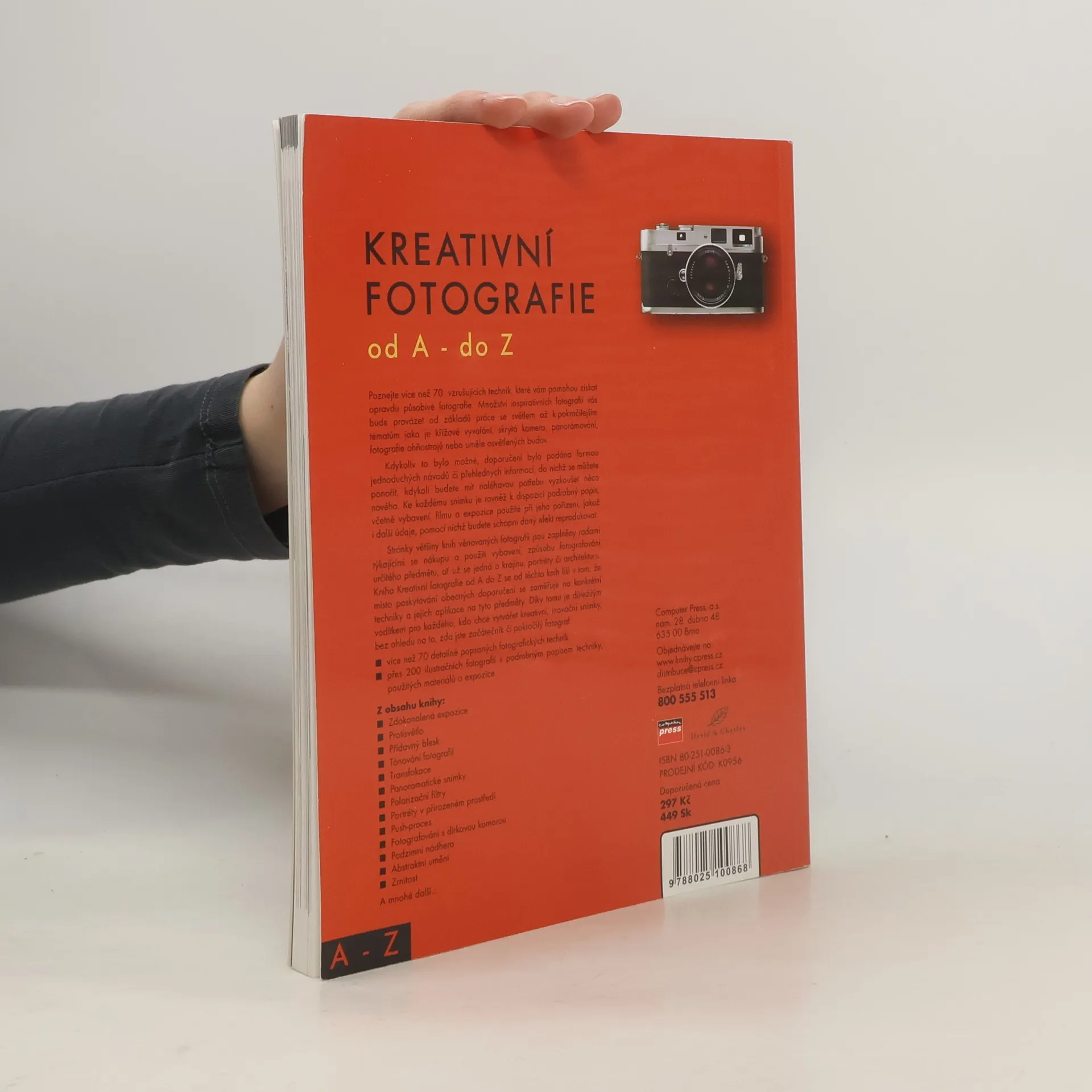 Poznejte více než 70 vzrušujících technik, které vám pomohou získat opravdu působivé fotografie. Množství inspirativních fotografií vás bude provázet od základů práce se světlem až k pokročilejším tématům jako je křížové vyvolání, skrytá kamera, panorámování, fotografie ohňostrojů nebo uměle osvětlených budov. Kdykoliv to bylo možné, doporučení byla podána formou jednoduchých návodů či přehledných informací, do nichž se můžete ponořit, kdykoli budete mít naléhavou potřebu vyzkoušet něco nového. Ke každému snímku je rovněž k dispozici podrobný popis, včetně vybavení, filmu a expozice použité při jeho pořízení, jakož i další údaje, pomocí nichž budete schopni daný efekt reprodukovat. Stránky většiny knih věnovaných fotografii jsou zaplněny radami týkajícími se nákupu a použití vybavení, způsobu fotografování určitého předmětu, ať už se jedná o krajinu, portréty či architekturu. Kniha Kreativní fotografie od A do Z se od těchto knih liší v tom, že místo poskytování obecných doporučení se zaměřuje na konkrétní techniky a jejich aplikace na tyto předměty. Díky tomu je důležitým vodítkem pro každého, kdo chce vytvářet kreativní, inovační snímky, bez ohledu na to, zda jste začátečník či pokročilý fotograf.