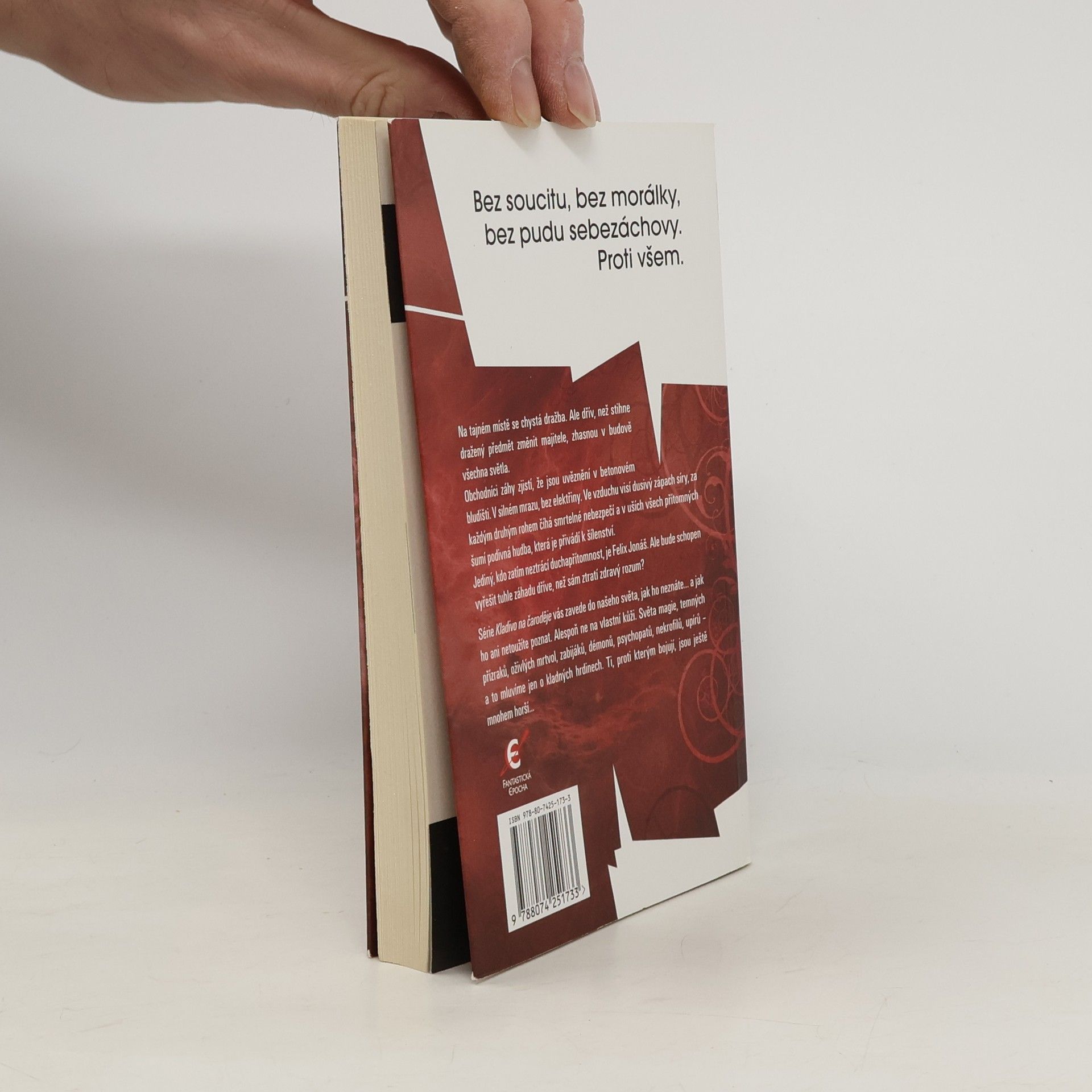 Na tajném místě se chystá dražba. Ale dřív, než stihne dražený předmět změnit majitele, zhasnou v budově všechna světla. Obchodníci záhy zjistí, že jsou uvěznění v betonovém bludišti. V silném mrazu, bez elektřiny. Ve vzduchu visí dusivý zápach síry, za každým druhým rohem číhá smrtelné nebezpečí a v uších všech přítomných šumí podivná hudba, která je přivádí k šílenství. Jediný, kdo zatím neztrácí duchapřítomnost, je Felix Jonáš. Ale bude schopen vyřešit tuhle záhadu dříve, než sám ztratí zdravý rozum? Série Kladivo na čaroděje vás zavede do našeho světa, jak ho neznáte… a jak ho ani netoužíte poznat. Alespoň ne na vlastní kůži. Světa magie, temných přízraků, oživlých mrtvol, zabijáků, démonů, psychopatů, nekrofilů, upírů – a to mluvíme jen o kladných hrdinech. Ti, proti kterým bojují, jsou ještě mnohem horší…