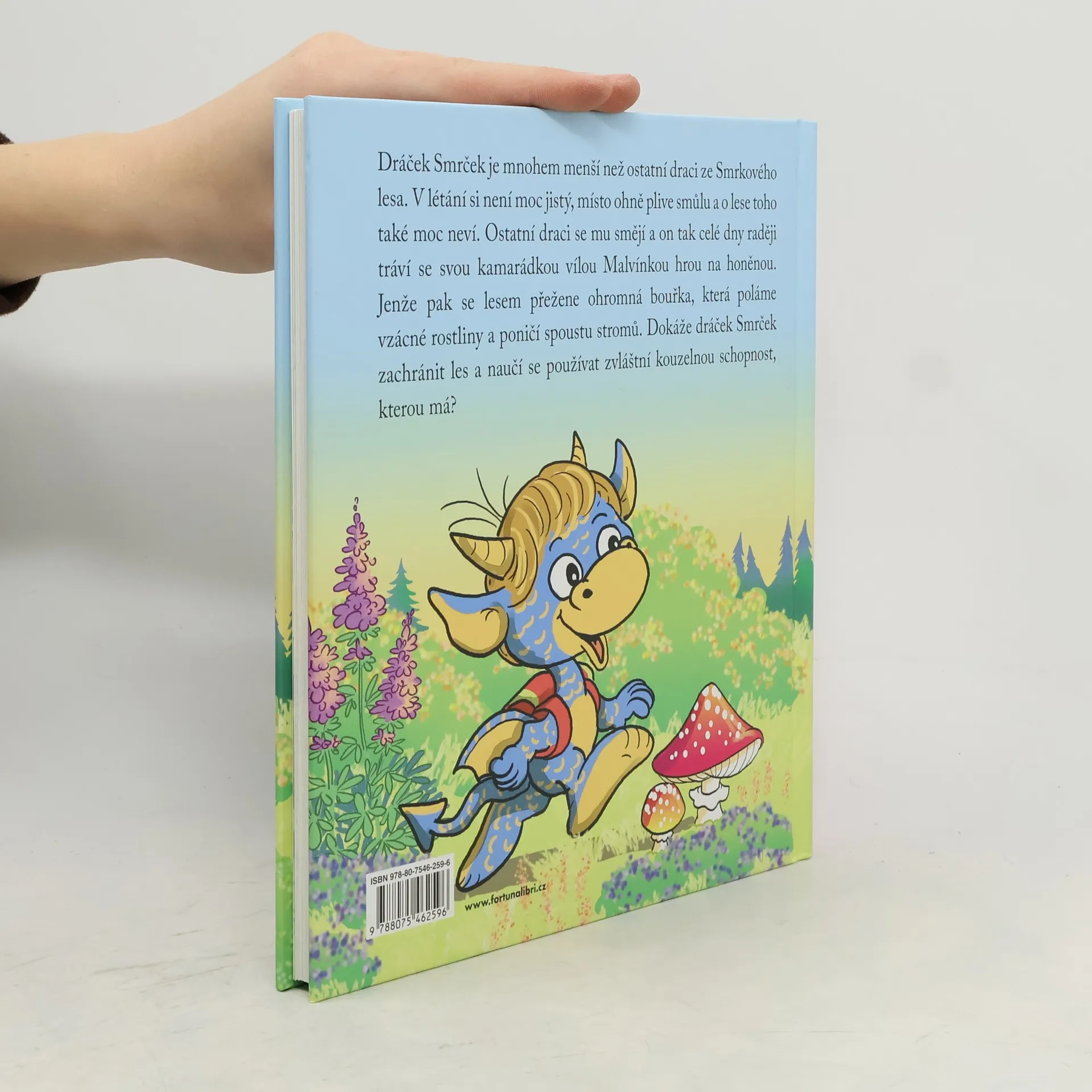 Dráček Smrček je mnohem menší než ostatní draci ze Smrkového lesa. V létání si není moc jistý, místo ohně plive smůlu a o lese toho také moc neví. Ostatní draci se mu smějí a on tak celé dny raději tráví se svou kamarádkou vílou Malvínkou hrou na honěnou. Jenže pak se lesem přežene ohromná bouřka, která poláme vzácné rostliny a poničí spoustu stromů. Dokáže dráček Smrček zachránit les a naučí se používat zvláštní kouzelnou schopnost, kterou má?