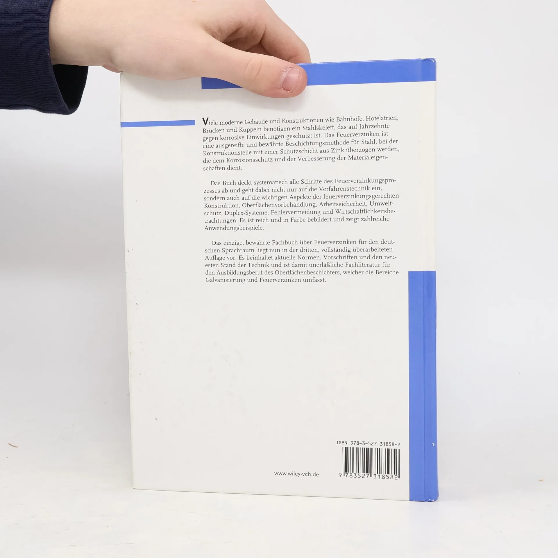 Viele moderne Gebäude und Konstruktionen wie Bahnhöfe, Hotelatrien, Brücken und Kuppeln benötigen ein Stahlskelett, das auf Jahrzehnte gegen schädliche Einwirkungen geschützt ist. Feuerverzinkung ist hierfür eine ausgereifte und bewährte Methode, deren Schutzüberzug aus Zink zuverlässig Stahlteile auf Jahrzehnte gegen schädliche Einwirkungen schützt. Das Buch deckt systematisch alle Schritte des Feuerverzinkungsprozesses ab und geht dabei nicht nur auf die Verfahrenstechnik ein, sondern auch auf die wichtigen Aspekte der feuerverzinkungsgerechten Konstruktion, Arbeitssicherheit, Umweltschutz, Duplex-Systeme und Wirtschaftlichkeitsbetrachtungen. Das Buch ist reich und in Farbe bebildert und zeigt zahlreiche Anwendungsbeispiele.