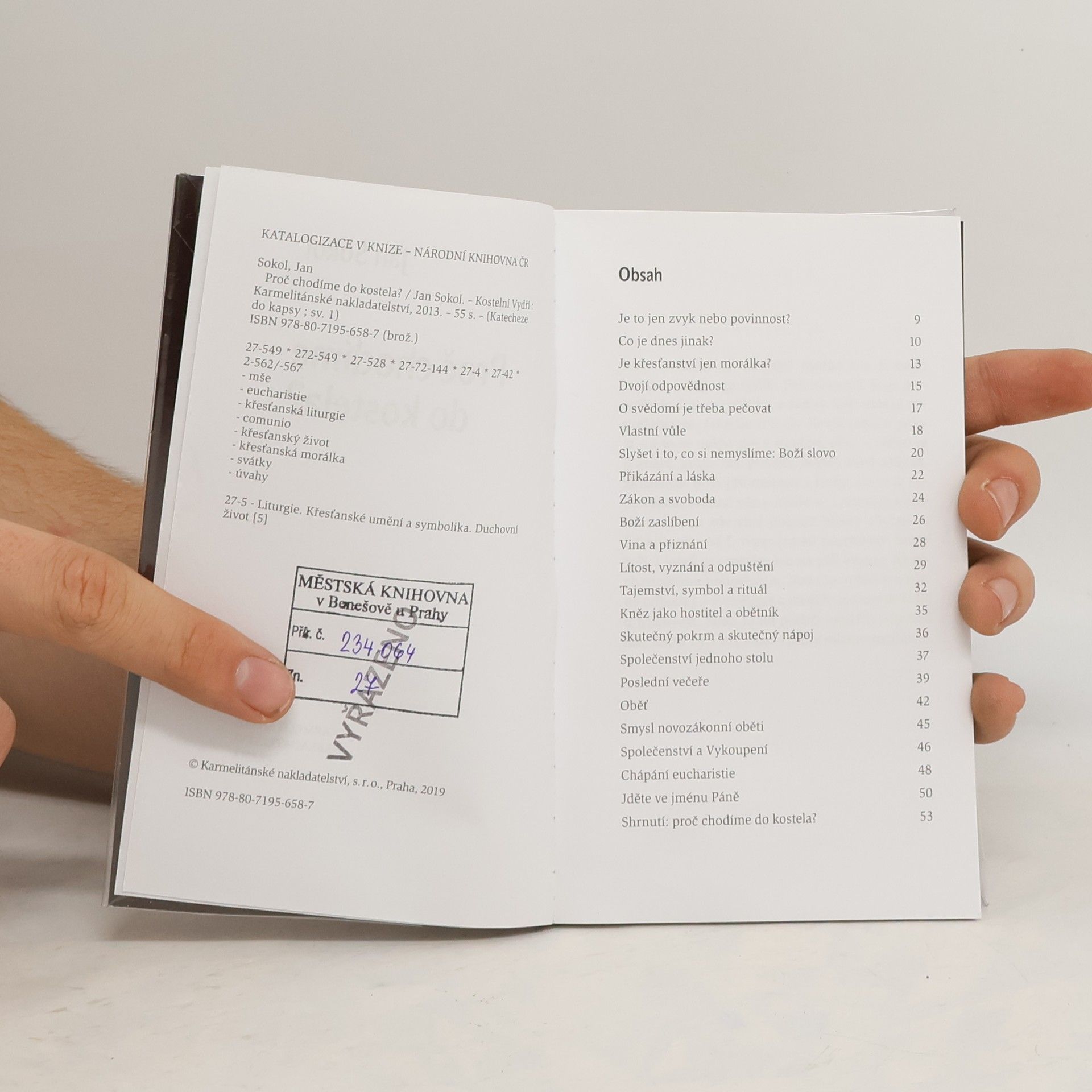 S chozením do kostela je to dnes ještě o něco těžší než s chozením do školy. Nepříjemné povinnosti totiž člověk lépe snáší, když ví, že to tak mají všichni. Všechny děti musí chodit do školy, všichni musíme platit daně a donedávna museli všichni mládenci na vojnu. Jenže do kostela se chodit zřejmě nemusí a většina lidí okolo nás tam prostě nechodí. Takže proč zrovna já?“ Prof. Jan Sokol se pokouší najít obyčejnou lidskou odpověď na jednoduchou, ale pro mnohé palčivou otázku. Ve středu jeho pozornosti je eucharistická bohoslužba a její mnohé významy v životě křesťana. S důkladností sobě vlastní nás uvádí do širších souvislostí tématu, a přitom se snaží hovořit jazykem přístupným pro nejširší čtenářskou obec. Knížka je určena těm, kdo do kostela chodí dobrovolně a rádi, i těm, kdo přirozenou motivaci nemají a potřebují najít hlubší smysl svého počínání.