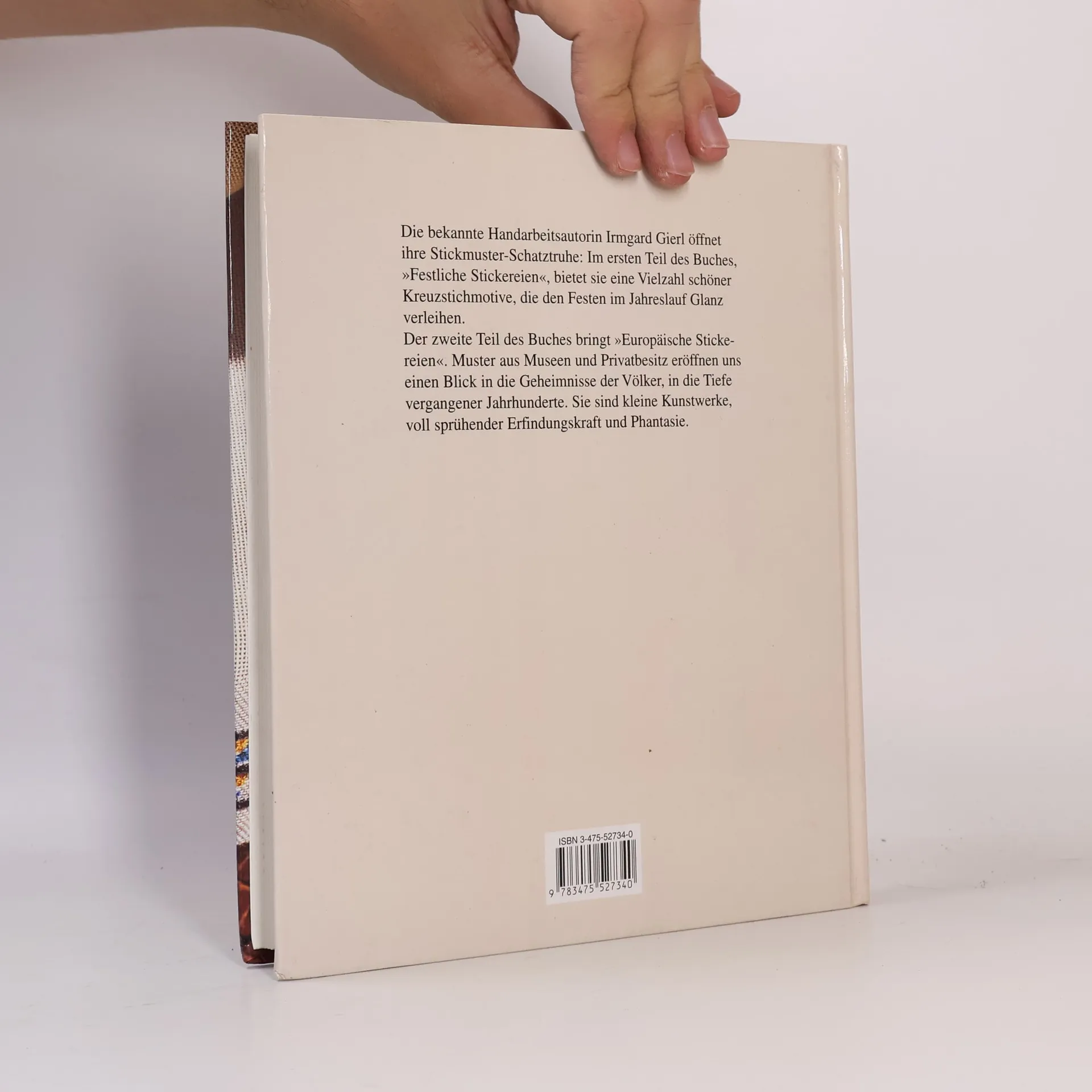 Die bekannte Handarbeitsautorin Irmgard Gierl öffnet ihre Stickmuster-Schatztruhe: Im ersten Teil des Buches, Festliche Stickereien, präsentiert sie eine Vielzahl schöner Kreuzstichmotive, die den Festen des Jahres Glanz verleihen. Der Zweite Teil bringt Europäische Stickereien: Muster aus Museen und Privatbesitz gewähren uns einen Blick in volkstümliche Kunstfertigkeiten und vergangene Jahrhunderte. Es sind kleine Kunstwerke, voll sprühender Erfindungskraft und Fantasie.