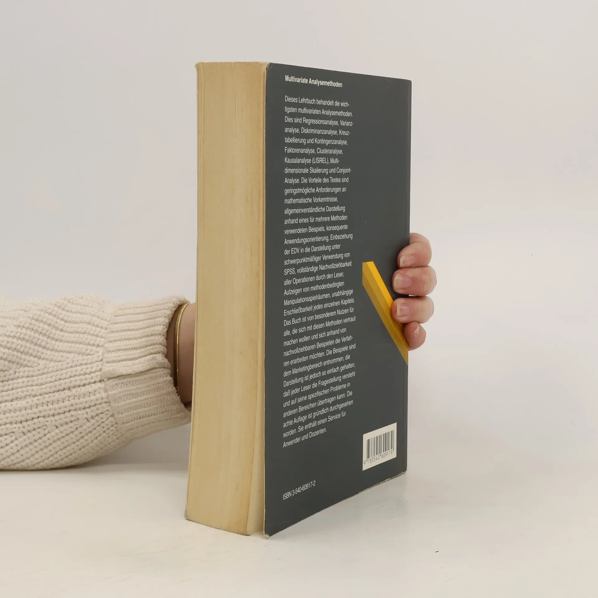 Dieses Lehrbuch behandelt die wichtigsten multivariaten Analysemethoden, n mlich Regressionsanalyse, Varianzanalyse, Faktorenanalyse, Clusteranalyse, Diskriminanzanalyse, Kausalanalyse (LISREL), Multidimensionale Skalierung und Conjoint-Analyse. Die Vorteile dieses Arbeitstextes sind geringstm gliche Anforderungen an mathematische Vorkenntnisse, allgemeinverst ndliche Darstellung anhand eines f r mehrere Methoden verwendeten Beispiels, konsequente Anwendungsorientierung, Einbeziehung der EDV in die Darstellung, vollst ndige Nachvollziehbarkeit aller Operationen durch den Leser, Aufzeigen von methodenbedingten Manipulationsspielr umen, unabh ngige Erschlie barkeit jedes einzelnen Kapitels. Das Buch ist von besonderem Nutzen f r alle, die sich mit diesen Methoden vertraut machen wollen.