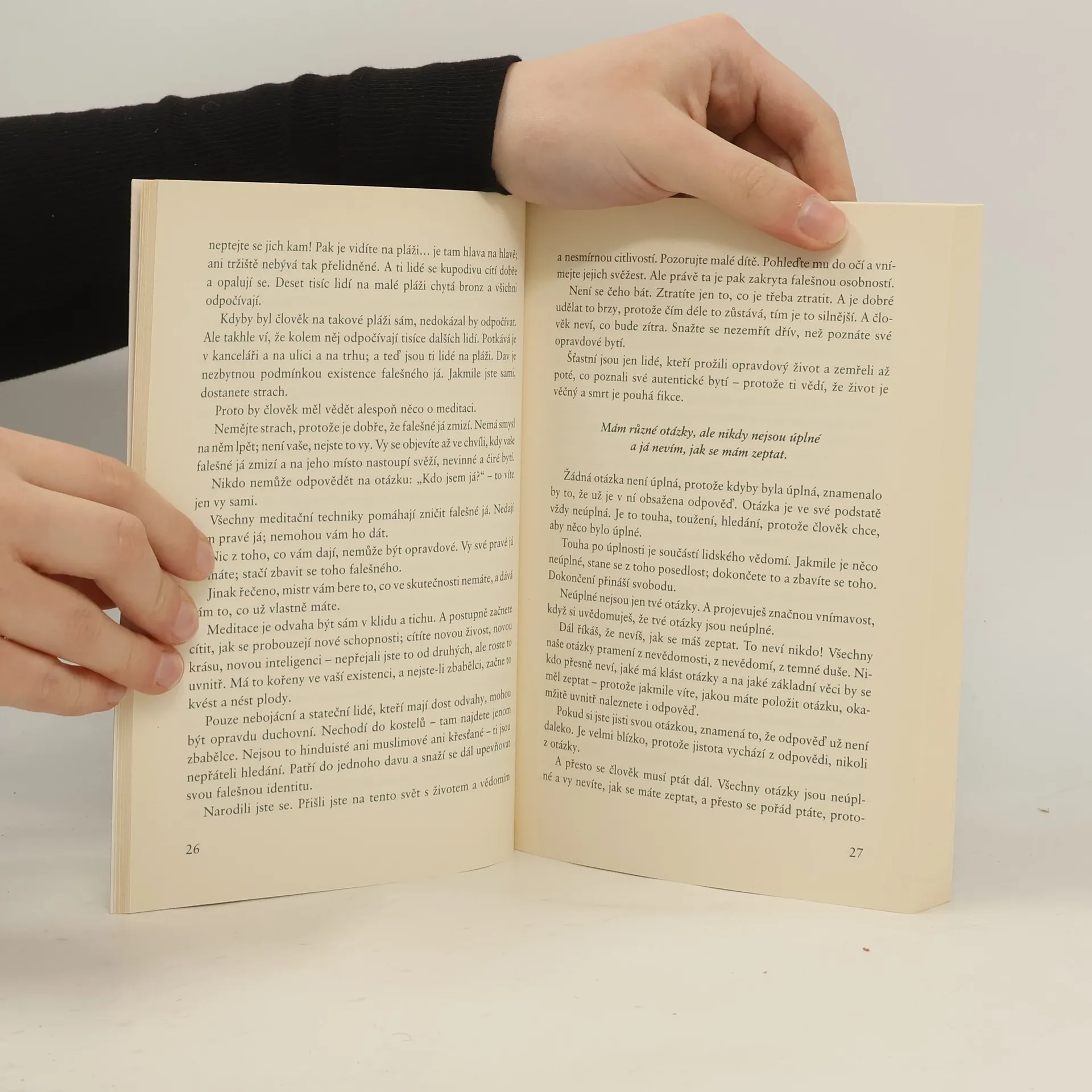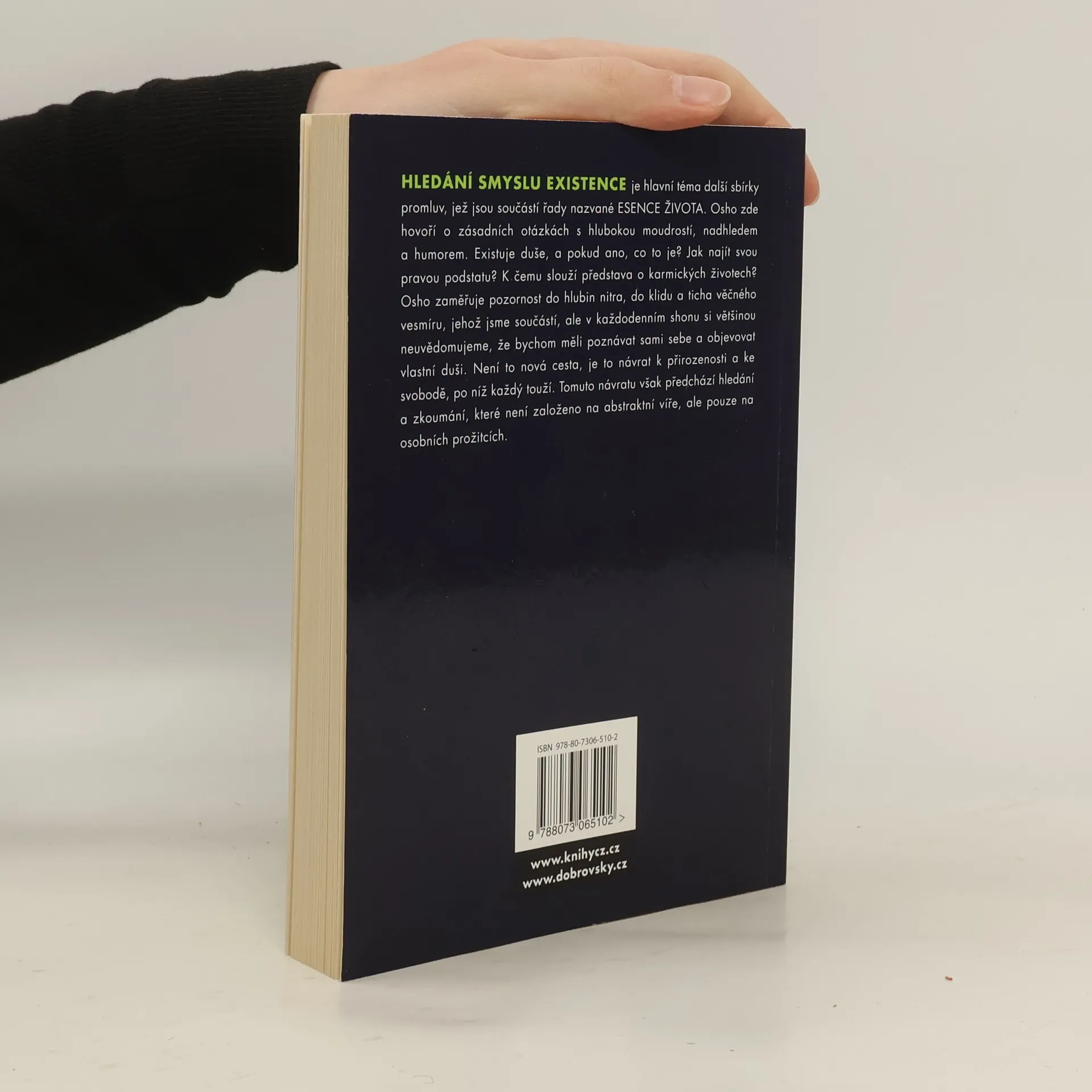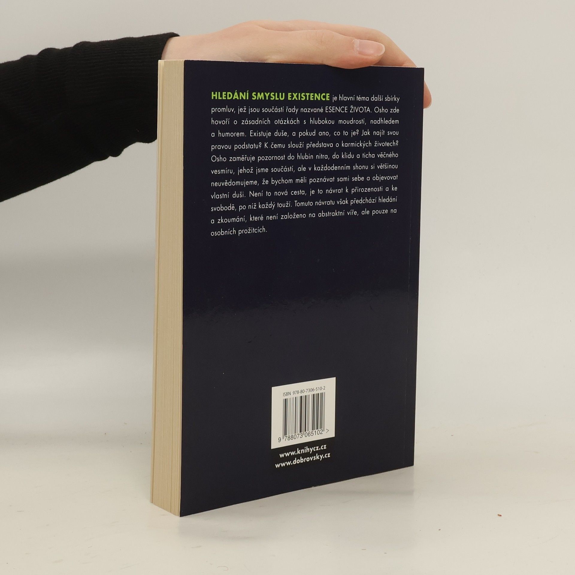 Hledání smyslu existence je hlavní téma další sbírky promluv, jež jsou součástí řady nazvané Esence života. Osho zde hovoří o zásadních otázkách s hlubokou moudrostí, nadhledem a humorem. Existuje duše, a pokud ano, co to je? Jak najít svou pravou podstatu? K čemu slouží představa o karmických životech? Osho zameřuje pozornost do hlubin nitra, do klidu a ticha věčného vesmíru, jehož jsme součástí, ale v každodenním shonu si většinou neuvědomujeme, že bychom měli poznávat sami sebe a objevovat vlastní duši.