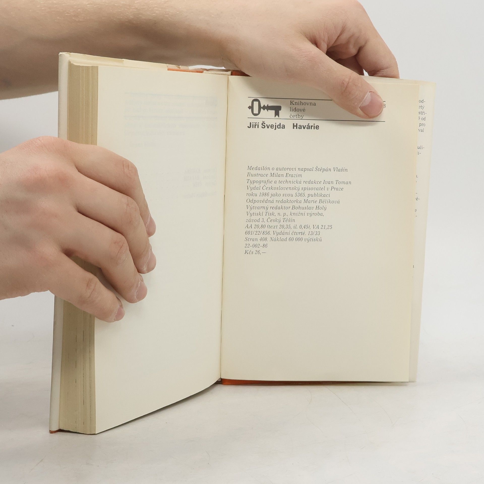 Havárii, vzrušující román o touze člověka po snadném blahobytu, vydal Jiří Švejda poprvé v Severočeském nakladatelství v roce 1975. Během deseti let se knížka dočkala dvou reedic a letos vychází již počtvrté, tentokrát v edici čtenářsky nejúspěšnějších titulů Klíč. Příběhmladého inženýra Kamila Coufala je situován do prostředí mostecké chemické továrny. Provoz průmyslového gigantu tvoří barvitou kulisu dramatu člověka, který si svou chorobnou ctižádostí zaslepeně připravoval osud citového trosečníka a téměř delikventa. Nadaný, ambiciózní Kamil má šťastné manželství, dobré místo a všechny předpoklady dokázat, že o své pracovní i společenské úspěchy se zasloužil jen on sám, a ne vysoké postavení jeho otce, technického náměstka chemičky. Stále silnější netrpělivost, závist a chtivost peněz, nezodpovědnost a později bezohlednost vedou Kamila k cíli cestami zdaleka ne legálními. Existuje pro něj možnost východiska ze životní krize? Teprve závěr příběhu naznačí odpověď na tuto otázku...