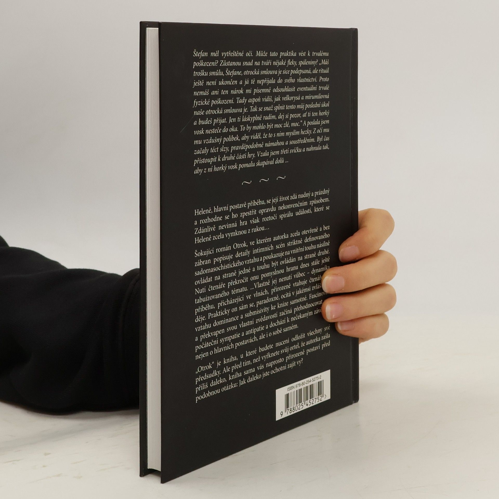 "...jsou to hlubiny lidské duše, co nás znepokojuje." Otrok je šokující román, ve kterém autorka zcela otevřeně a bez zábran popisuje detaily intimních scén striktně definovaného sadomasochistického vztahu a poukazuje na vnitřní touhu násilně ovládat na straně jedné a touhu být ovládán na straně druhé. Nutí čtenáře překročit onu pomyslnou hranu dnes stále ještě tabuizovaného tématu.