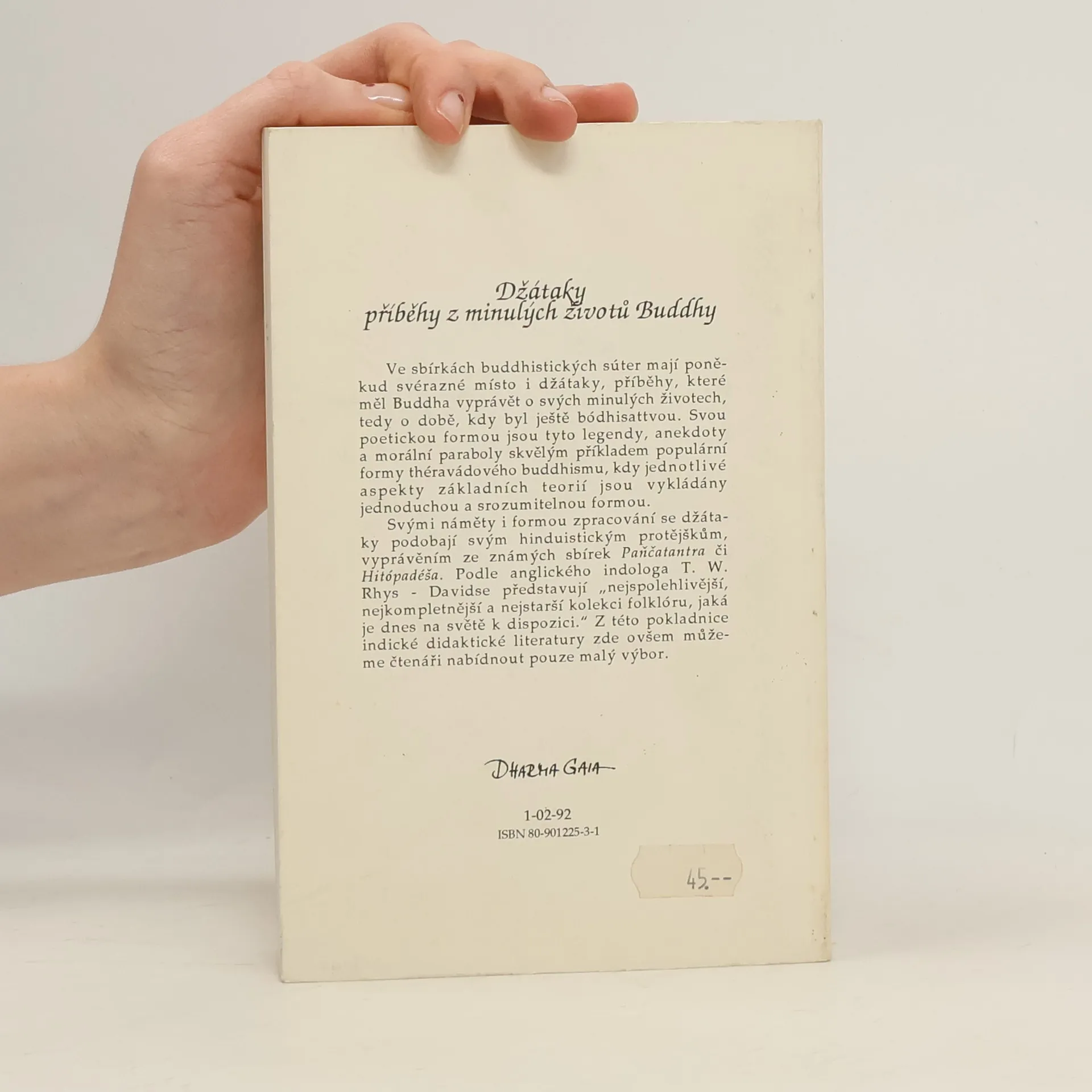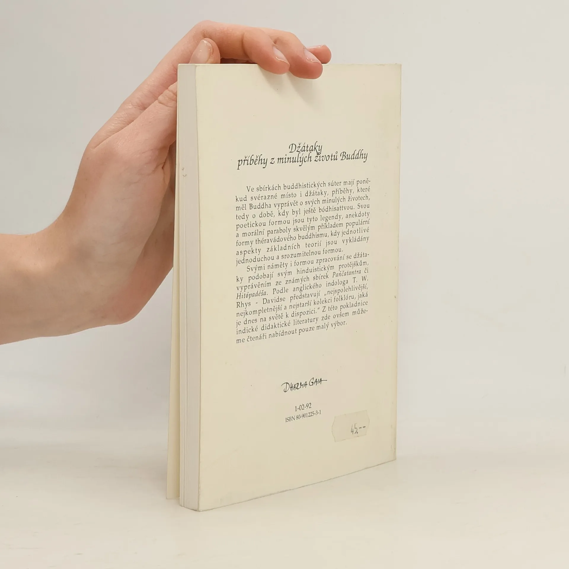 V kanonických buddhistických sbírkách textů mají poněkud svérázné místo i džátaky, příběhy, které měl Buddha vyprávět o svých minulých životech, kdy byl ještě Bódhisattou. Svou poetickou formou jsou tyto legendy, anekdoty a morální paraboly skvělým příkladem populární formy théravádového buddhismu, kdy jednotlivé aspekty základních teorií jsou vykládány jednoduchou a srozumitelnou formou. Svými náměty i formou zpracování se džátaky podobají svým hinduistickým protějškům, vyprávěním ze známých sbírek Paňčatantra či Hitópadéša. Svým obsahem i vlivem, který daleko přesáhl hranice Indie, patří buddhistické džátaky k základním dílům světového písemnictví. Podle anglického indologa T. W. Rhys Davidse představují "nejspolehlivější, nejkompletnější a nejstarší kolekci folklóru, jaká je dnes na světě k dispozici". Druhé vydání má 406 stran a je rozšířeno o padesát nejzajímavější ukázek z obsáhlého pálijského díla, které nepochybně patří k základním dílům světového písemnictví.
