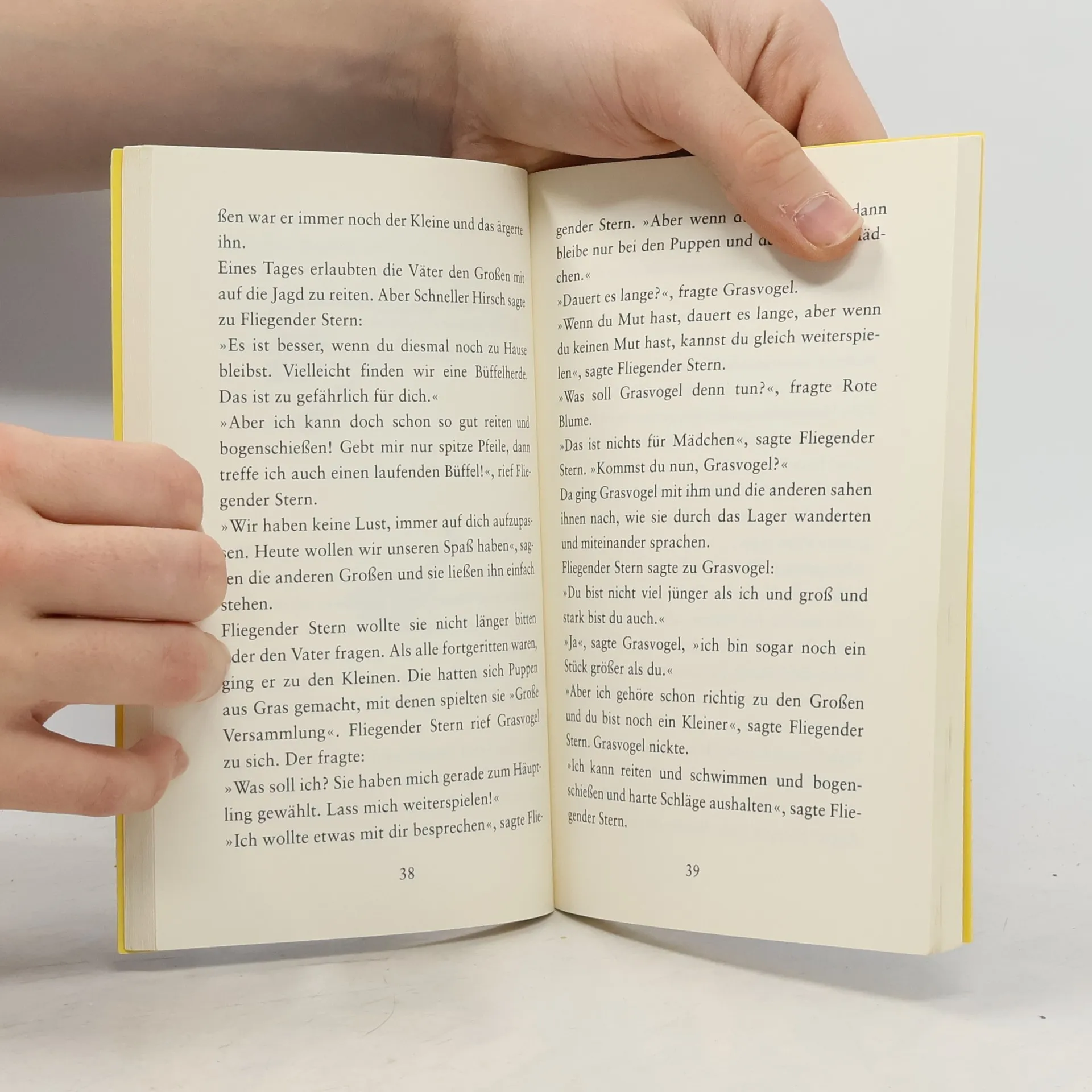 Eines Tages machen sich die beiden Indianerjungen Fliegender Stern und Grasvogel mutig und ohne Wissen der Erwachsenen auf den Weg zu den Weißen, um zu erfahren, warum diese in ihr Land gekommen sind, die Eisenbahn gebaut und die großen Büffelherden vertrieben haben, so dass die Indianer um ihre Existenz fürchten müssen. Auch wenn sich diese Entwicklung nicht zurückdrehen lässt, machen die beiden Jungen die Erfahrung, dass es durchaus Weiße gibt, mit denen man reden kann und die die Indianer respektieren. Als Fliegender Stern und Grasvogel dann von ihrem Abenteuer zurückkehren, werden sie von ihrem Stamm für diese mutige, wenn auch eigenwillige Aktion voller Hochachtung empfangen.
