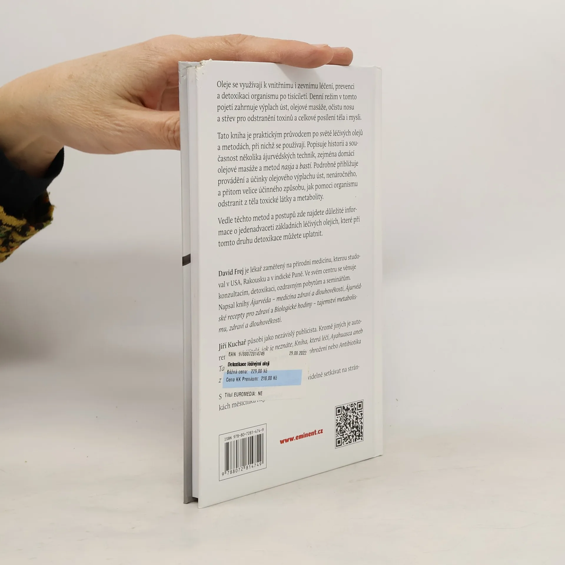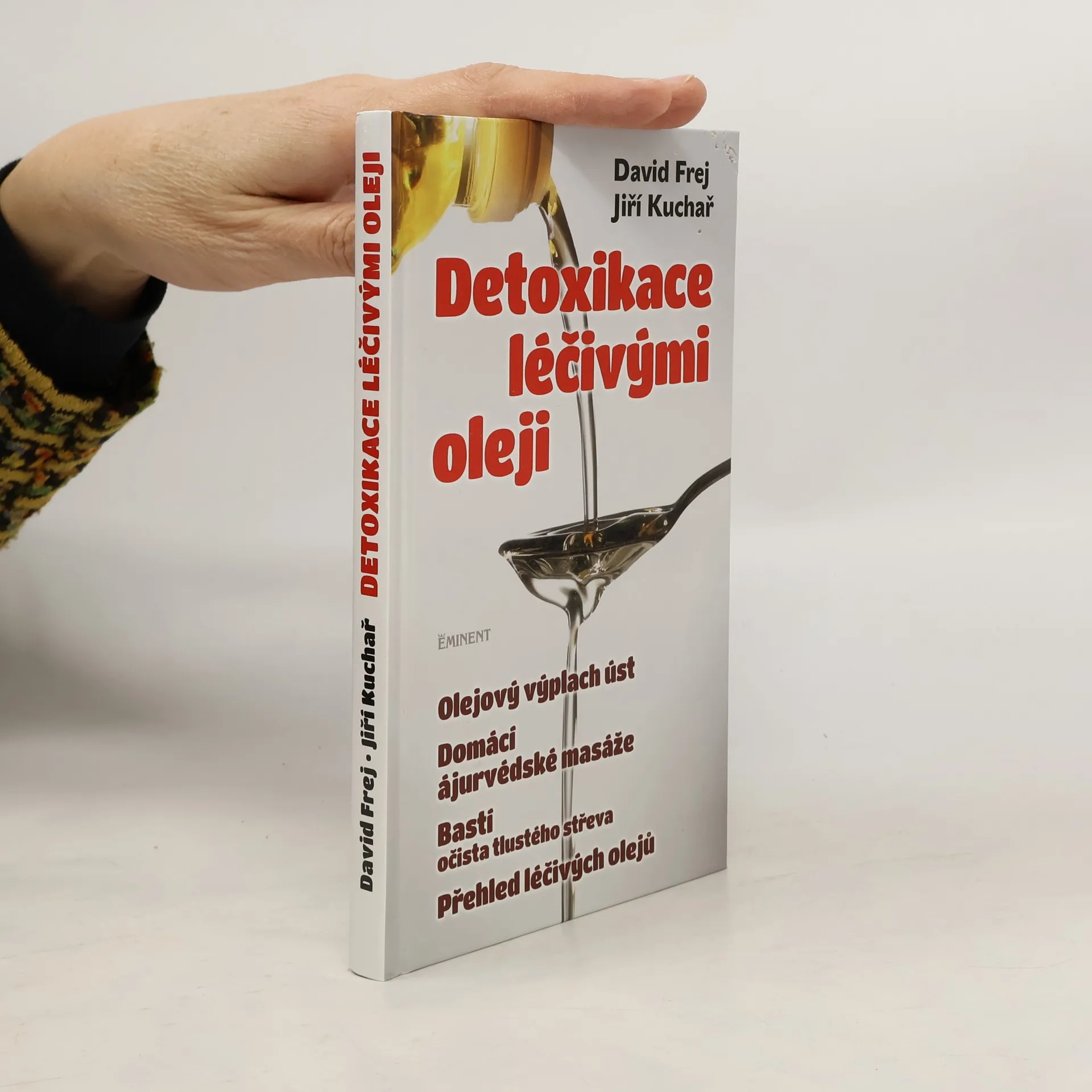 Oleje se využívají k vnitřnímu i zevnímu léčení, prevenci a detoxikaci organismu po tisíciletí. Denní režim v tomto pojetí zahrnuje výplach úst, olejové masáže, očistu nosu a střev pro odstranění toxinů a celkové posílení těla i mysli. Tato kniha je praktickým průvodcem po světě léčivých olejů a metodách, při nichž se používají. Popisuje historii a současnost několika ájurvédských technik, zejména domácí olejové masáže a metod nasja a bastí. Podrobně přibližuje provádění a účinky olejového výplachu úst, nenáročného, a přitom velice účinného způsobu, jak pomoci organismu odstranit z těla toxické látky a metabolity. Vedle těchto metod a postupů najdete v knize podrobné informace o jedenadvaceti základních léčivých olejích, které při tomto druhu detoxikace můžete uplatnit. David Frej je lékařem přírodní medicíny, kterou studoval v USA, Rakousku a v indické Puně. Ve svém centru se věnuje konzultacím, masážím, ozdravným pobytům a seminářům. Napsal knihy Ájurvéda – medicína zdraví a dlouhověkosti, Ájurvédské recepty pro zdraví a Biologické hodiny – tajemství metabolismu, zdraví a dlouhověkosti. Jiří Kuchař působí jako nezávislý publicista. Kromě jiných je autorem knih Léčitelé, jak je neznáte, Kniha, která léčí, Poznej sám sebe, Zdraví v ohrožení nebo Antibiotika z přírody. S příspěvky obou autorů se můžete pravidelně setkávat na stránkách měsíčníku Regenerace.