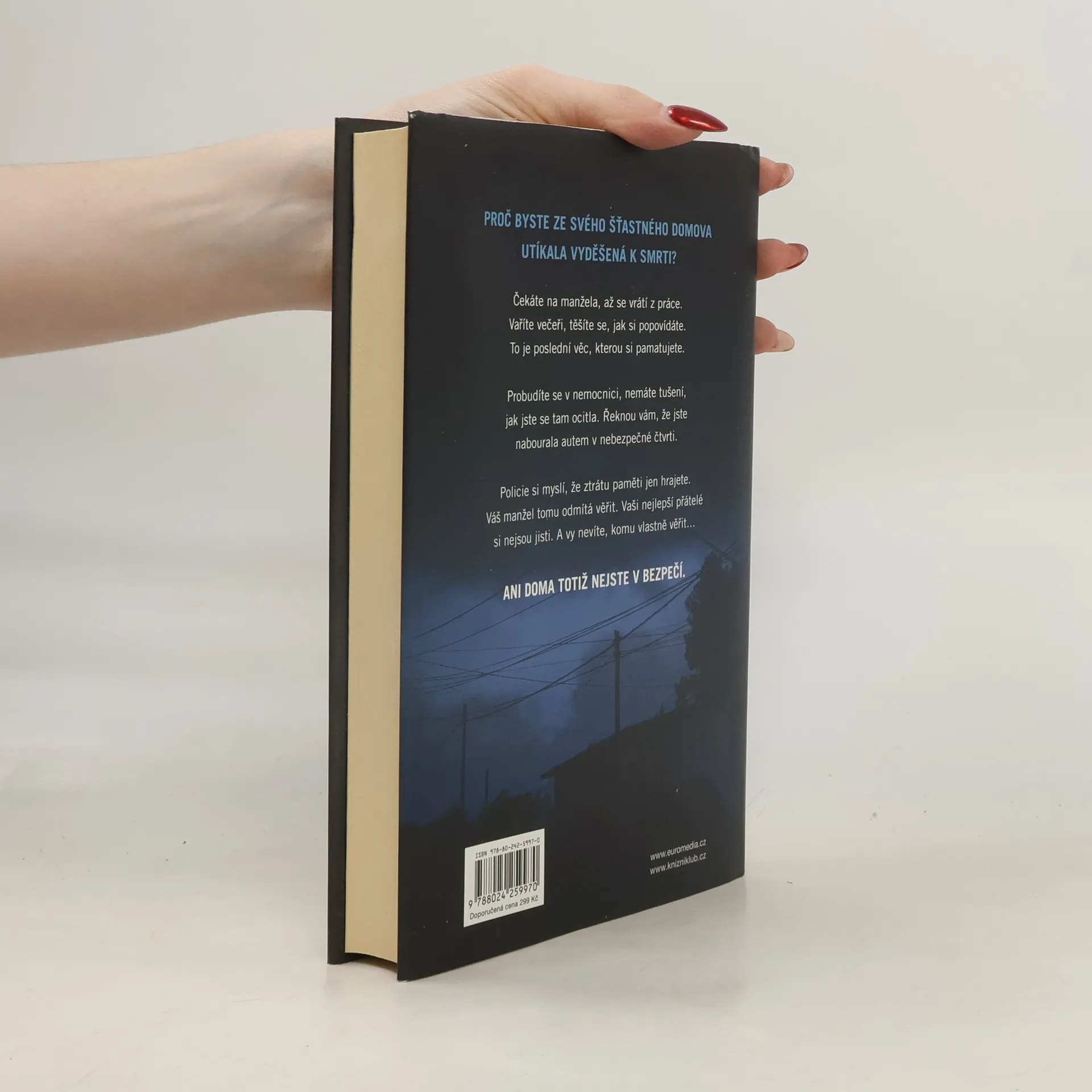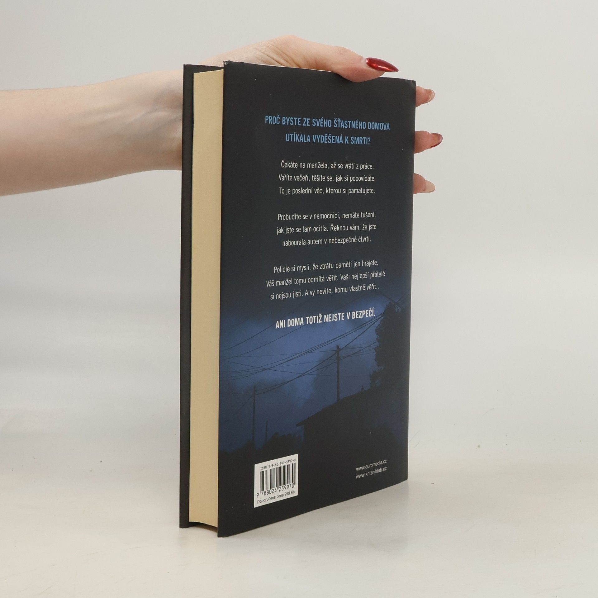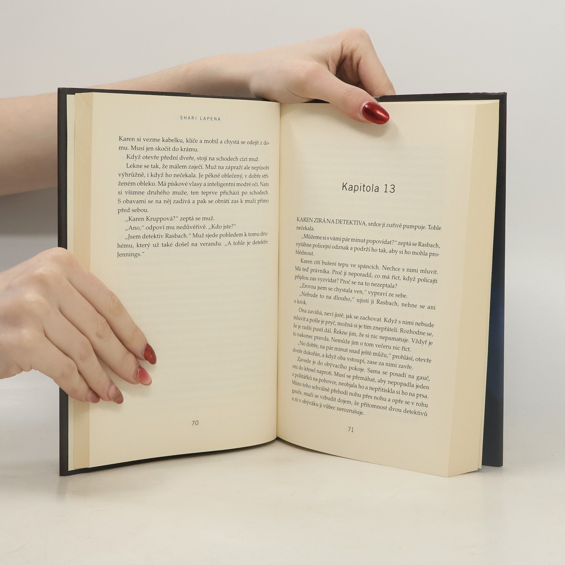 V téhle útulné čtvrti spokojených domovů zůstávají nebezpečné lži uzavřeny za dveřmi… Shari Lapena, autorka thrilleru roku 2017 Manželé odvedle, přichází s dalším rodinným dramatem plným tajemství a nečekaných zvratů, které nikdy nepřestanou překvapovat. Karen a Tom Kruppovi jsou šťastní – vzali se teprve nedávno a vlastní nádherný dům poblíž New Yorku. Jednoho dne se Tom vrátí domů a zjistí, že Karen zmizela – její auto je pryč a zdá se, že odjela ve spěchu. Nevzala si dokonce ani kabelku, telefon, doklady. Krátce nato se Tom dozví, že Karen měla nehodu a leží v nemocnici s otřesem mozku a ztrátou paměti. Po čase se Karen, odhodlaná vyléčit se a zapomenout, vrací s Tomem domů. Ale zdá se, že se tam něco změnilo. Něco není v pořádku. Někdo tam byl. Někdo cizí. Jenže v tomhle domě je každý cizí. Každý má něco, co by podle něj mělo zůstat skryto. Něco, kvůli čemu by raději vraždil, jen aby si to mohl nechat pro sebe...