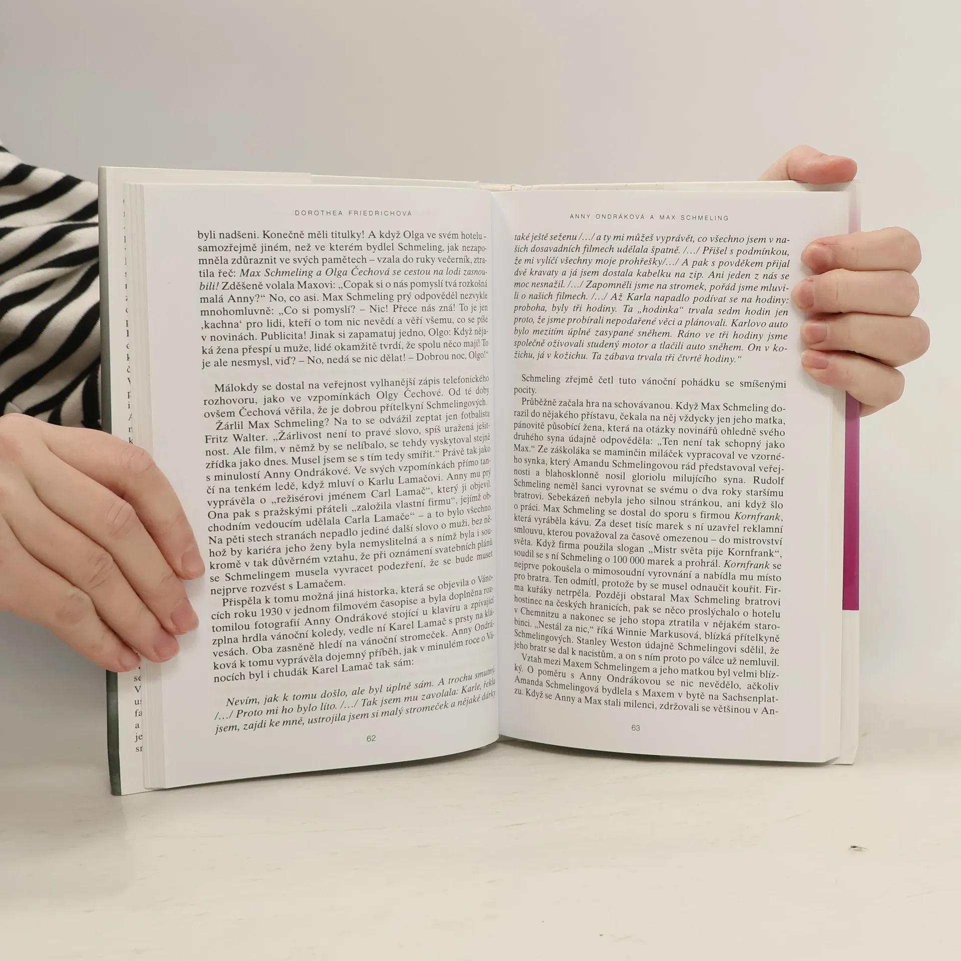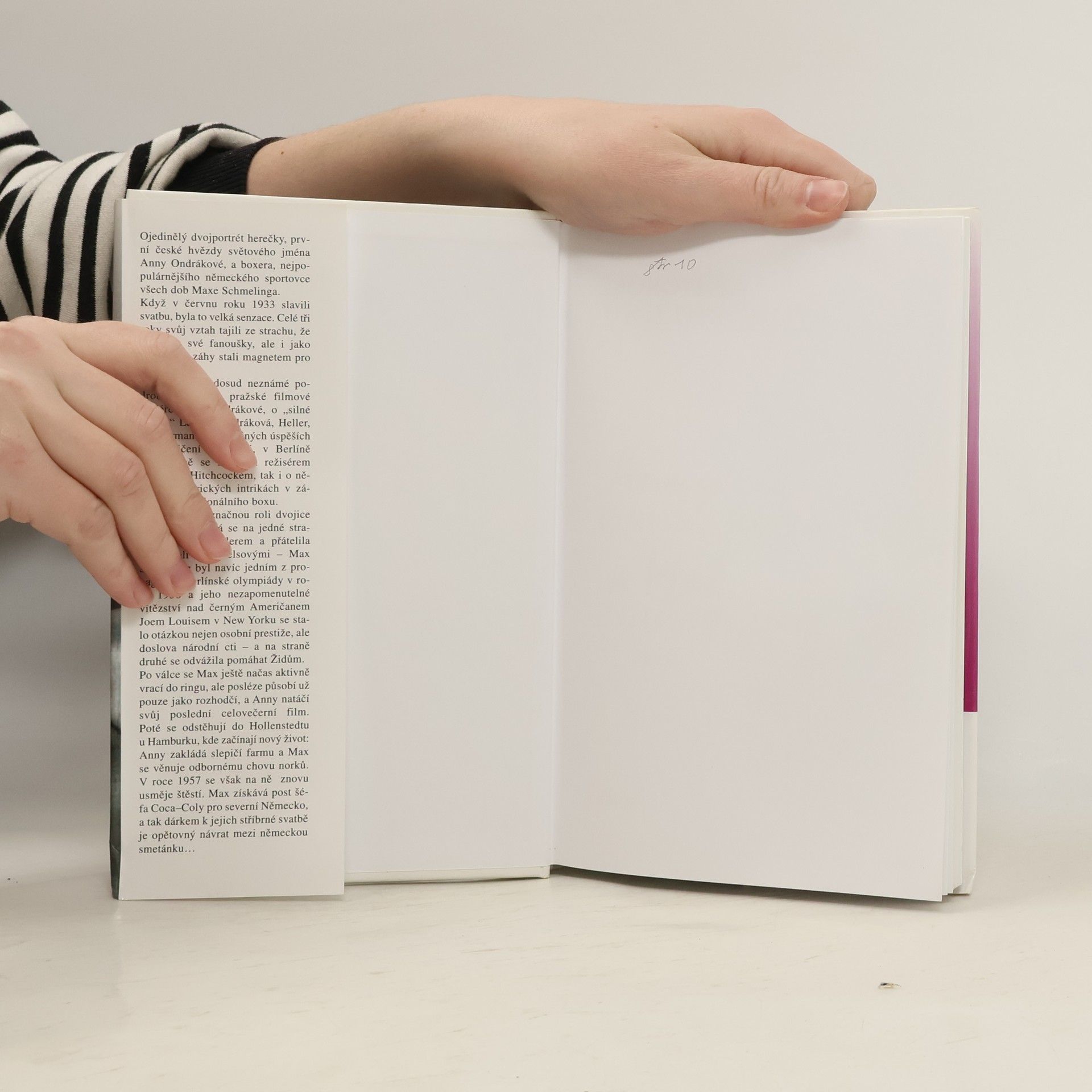 Kniha popisuje soukromý život české herečky a německého boxera. Ojedinělý dvojportrét herečky, první české hvězdy světového jména, a boxera, nejpopulárnějšího německého sportovce všech dob. Když v r. 1933 slavili svatbu, byla to senzace. Tři roky svůj vztah tajili, aby nezklamali fanoušky, ale i jako dvojice přitahovali publikum... Kniha uvádí dosud neznámé podrobnosti o pražské filmové kariéře A. Ondrákové, o "silné čtyřce" Lamač, Ondráková, Heller, Wassermann i o německo-amerických intrikách v zákulisí profesionálního boxu. Odhaluje dvojznačnou roli dvojice v třetí říši, jež se stýkala s Hitlerem a Goebbelsovými. Schmelingovo nezapomenutelné vítězství nad Joem Louisem v New Yorku se stalo otázkou osobní prestiže i doslova národní cti.