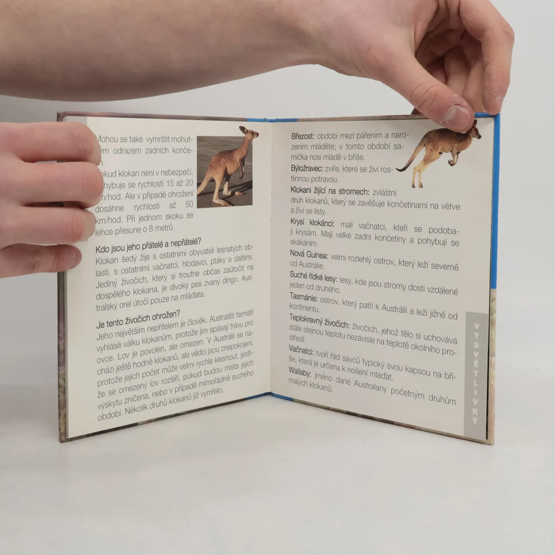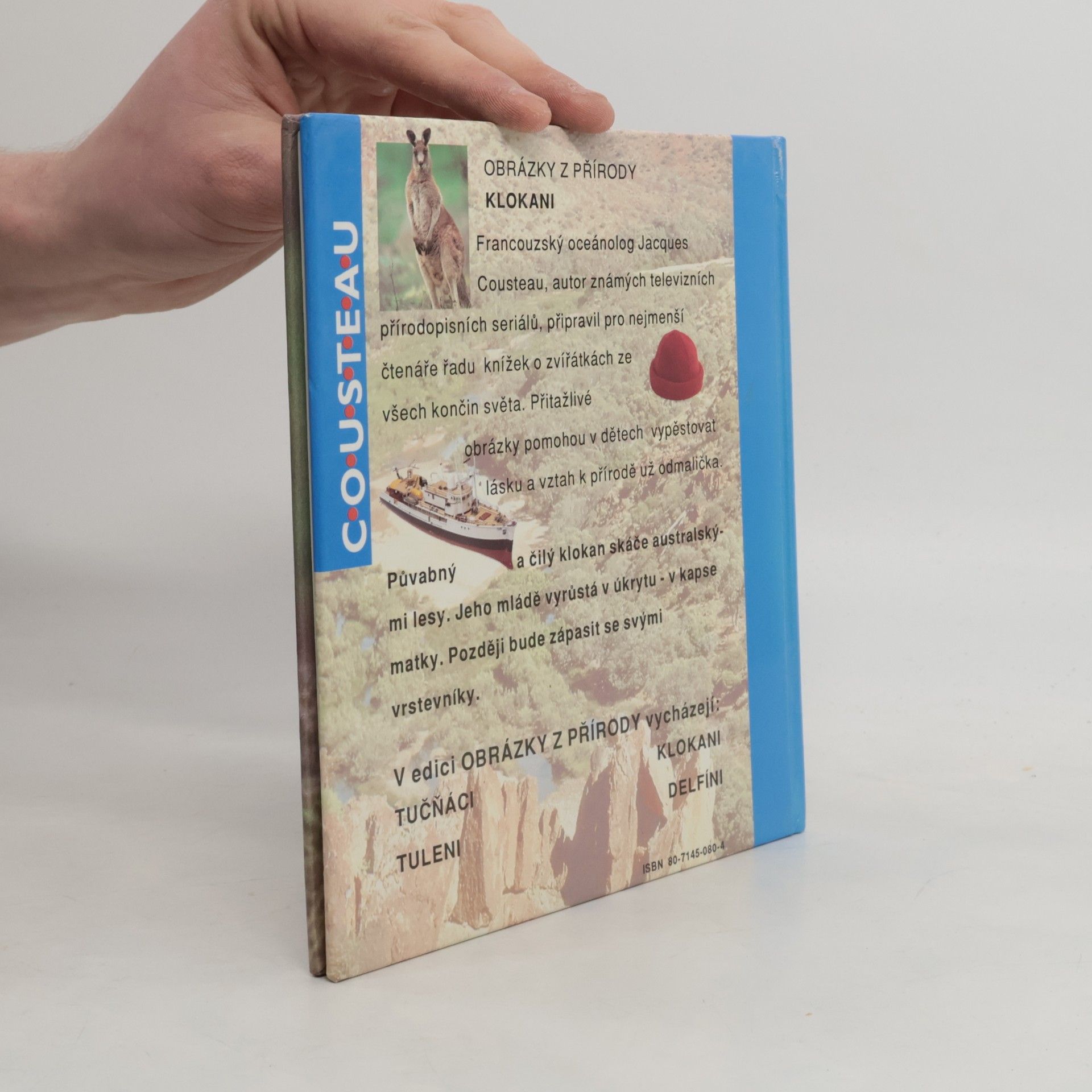 Francouzský oceánolog Jacques Cousteau, autor známých televizních přírodopisných seriálů, připravil pro nejmenší čtenáře řadu knížek o zvířátkách ze všech končin světa. Přitažlivé obrázky pomohou v dětech vypěstovat lásku a vztah k přírodě už odmalička. Půvabný a čilý klokan skáče australskými lesy. Jeho mládě vyrůstá v úkrytu – v kapse matky. Později bude zápasit se svými vrstevníky.