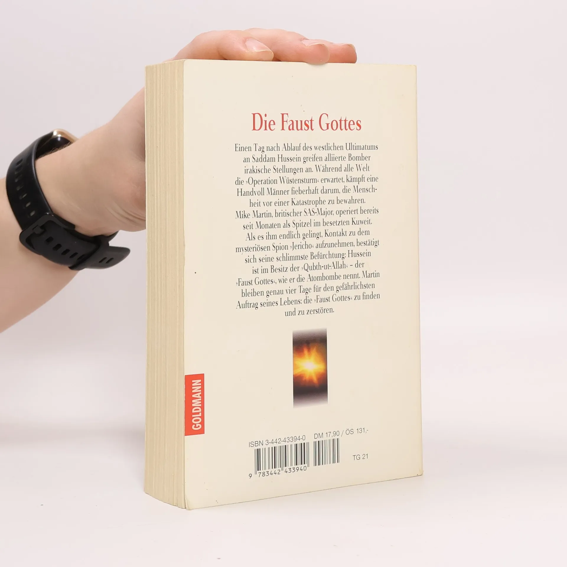 Einen Tag nach Ablauf des westlichen Ultimatums an Saddam Hussein greifen alliierte Bomber irakische Stellungen an. Während alle Welt die "Operation Wüstensturm" erwartet. kämpft eine Handvoll Männer fieberhaft darum. die Menschheit vor einer Katastrophe zu bewahren. Mike Martin, britischer SAS-Major, operiert bereits seit Monaten als Spitzel im besetzten Kuweit. Als es ihm endlich gelingt, Kontakt zu dem mysteriösen Spion "Jericho" aufzunehmen, bestätigt sich seine schlimmste Befürchtung: Hussein ist im Besitz der "Qubthut-Allah" - der "Faust Gottes". wie er die Atombombe nennt. Martin bleiben genau vier Tage für den gefährlichsten Auftrag seines Lebens: die "Faust Gottes" zu finden und zu zerstören.