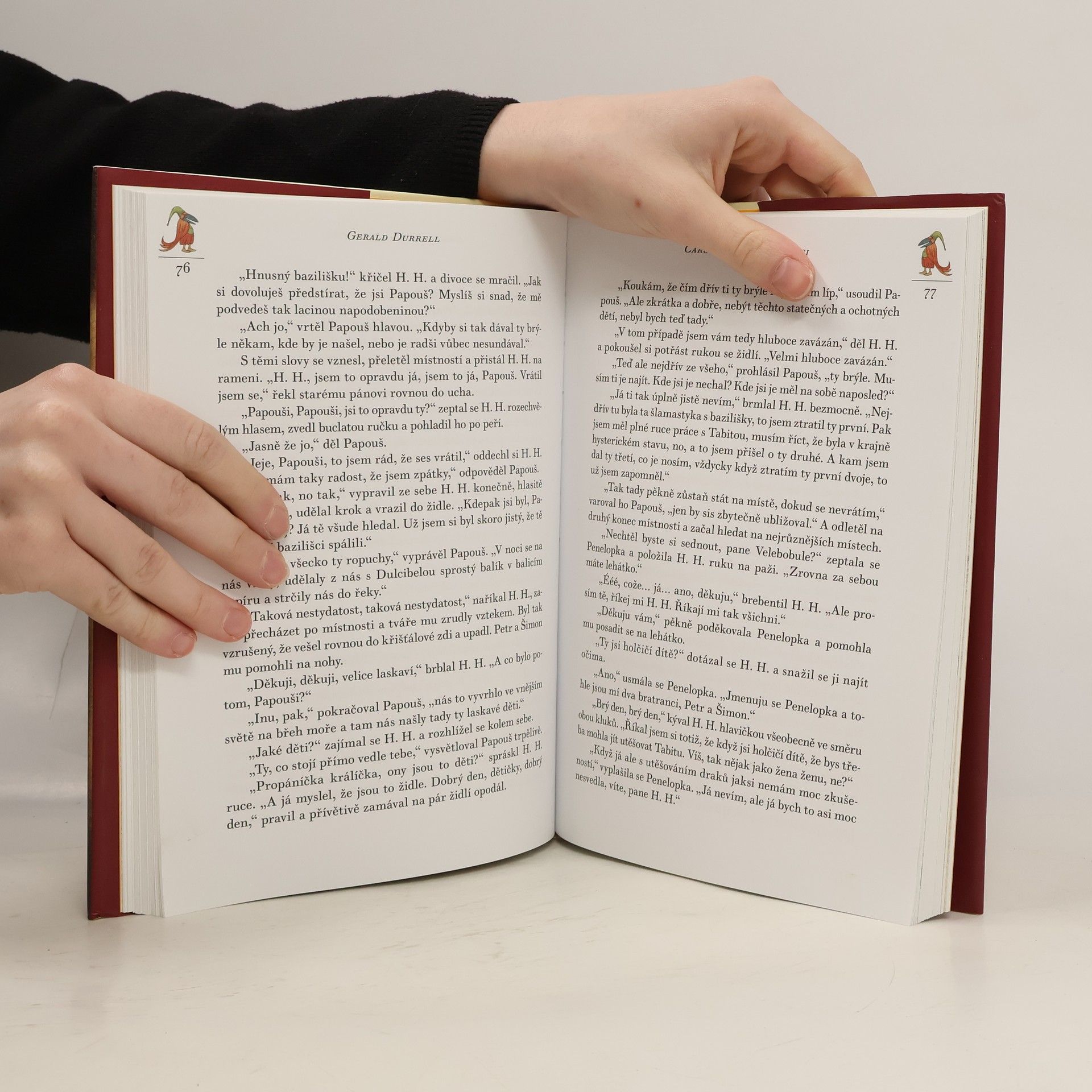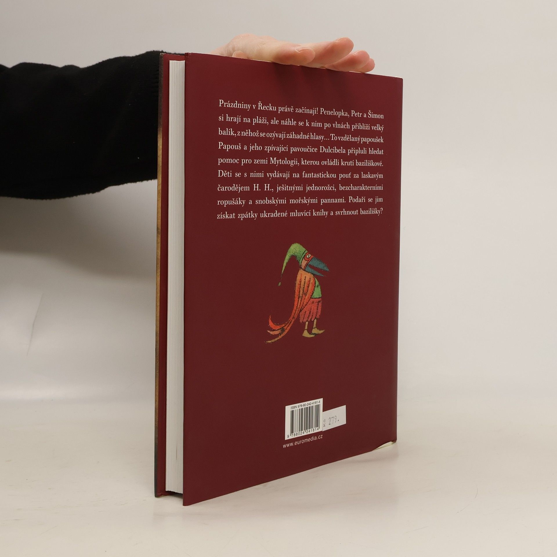 Prázdniny v Řecku právě začínají! Penelopka, Petr a Šimon si hrají na pláži, ale náhle se k nim po vlnách přiblíží velký balík, z něhož se ozývají záhadné hlasy... To vzdělaný papoušek Papouš a jeho zpívající pavoučice Dulcibela připluli hledat pomoc pro zemi Mytologii, kterou ovládli krutí baziliškové. Děti se s nimi vydávají na fantastickou pouť za laskavým čarodějem H. H., ješitnými jednorožci, bezcharakterními ropušáky a snobskými mořskými pannami. Podaří se jim získat zpátky ukradené mluvící knihy a svrhnout bazilišky? Půvabný pohádkový příběh pro děti z pera autora oblíbených příběhů o zvířatech (O mé rodině a jiné zvířeně, Chytněte mi guerézu, Ptáci, zvířata a moji příbuzní).
