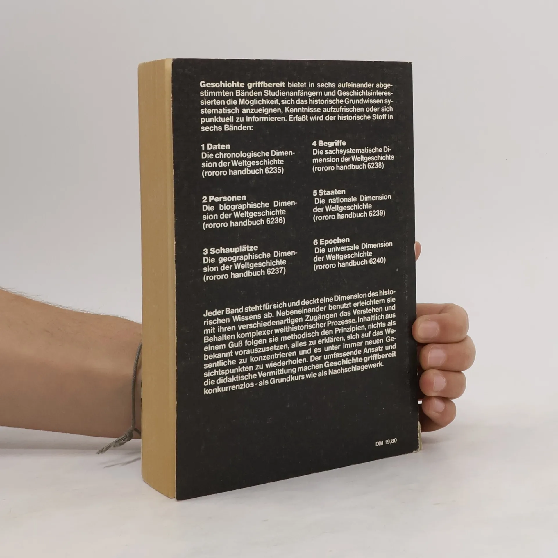 "Geschichte griffbereit" präsentiert die gesamte Weltgeschichte von den Anfängen bis zur Gegenwart außergewöhnlich übersichtlich und benutzerfreundlich. Der Historiker Prof. Imanuel Geiss (Universität Bremen) hat hierfür einen völlig neuen Typ des Nachschlagewerks entwickelt: Die sechs Dimensionen der Weltgeschichte: Epochen, Daten, Personen, Schauplätze, Begriffe und Staaten werden in jeweils einem abgeschlossenen Band behandelt. Alle Bände sind eng miteinander verknüpft, ein eigener Registerband ermöglicht den schnellen Zugriff auf sämtliche Informationen des Gesamtwerks.