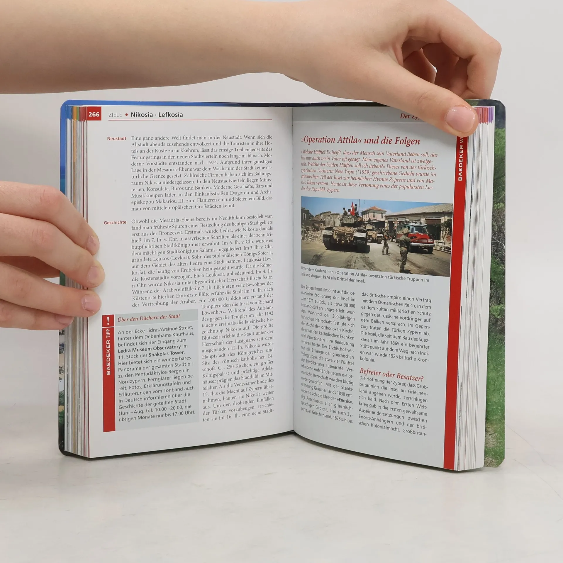 Der Baedeker Zypern führt zu den Spuren der Aphrodite entlang kilometerlanger Sandstrände und imposanter Steilküsten und präsentiert die Insel als ein Erlebnisziel mit hoher Qualität und exzellenter Gastronomie. Das Kulturerbe der zweigeteilten Insel umfasst verschiedene Epochen, historische Streitkräfte und Freizeitmöglichkeiten. Im Kapitel Hintergrund werden interessante Informationen über Land und Leute, Wirtschaft, Geschichte, Kunst und Alltagsleben vermittelt. Fragen zu typischen Gerichten und kinderfreundlichen Aktivitäten werden im Kapitel „Erleben und Genießen“ beantwortet. Spannende Touren führen durch das Tróodos-Gebirge, in die Metropole Zyperns, malerische Altstädte und an schöne Badeplätze, während das Kapitel Sehenswürdigkeiten von A - Z detaillierte Beschreibungen wichtiger Orte bietet. Infografiken bieten einen Überblick über Zypern, Aphrodite und die geteilte Insel. Einzigartige 3D-Darstellungen zeigen unter anderem ein Haus mit Erdbebenspuren und das Haus des Dionysos. Baedeker-Tipps verraten, wo man in malerischer Umgebung Fisch genießen kann, wie man im Kloster von Chrysorrogiátissa bei köstlichem Wein entspannen kann und wo man traditionelles Kunsthandwerk erwerben kann.