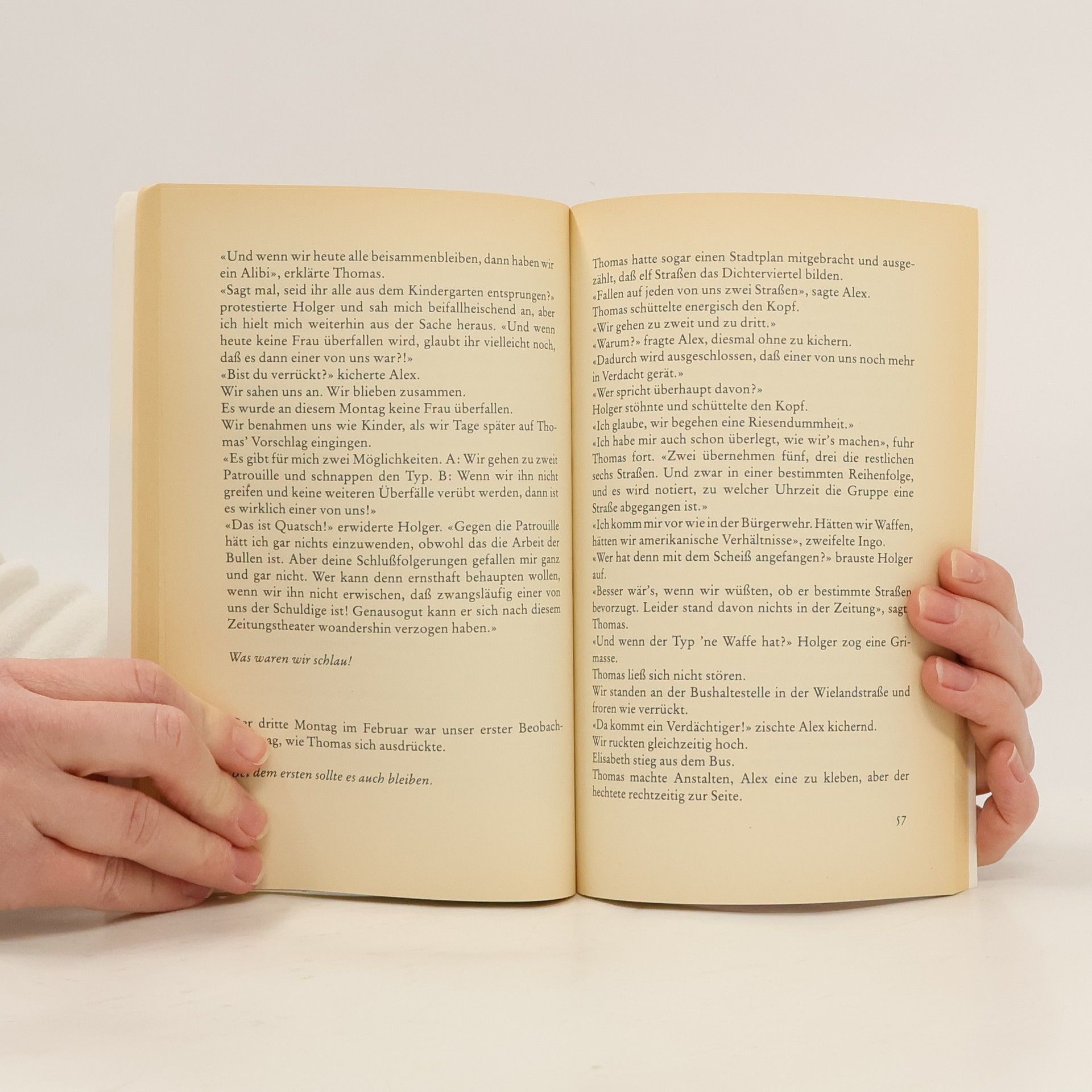 Im Villenviertel einer Großstadt werden nacheinander mehrere Raubüberfälle auf alte Frauen verübt. Rolf, der in der Gegend wohnt, sucht mit seinen Schulkameraden nach dem Täter, da sie alle selber in Verdacht geraten. Tatsächlich findet Rolf ihn auch, aber er muss feststellen, dass er sein Wissen nicht weitergeben kann.