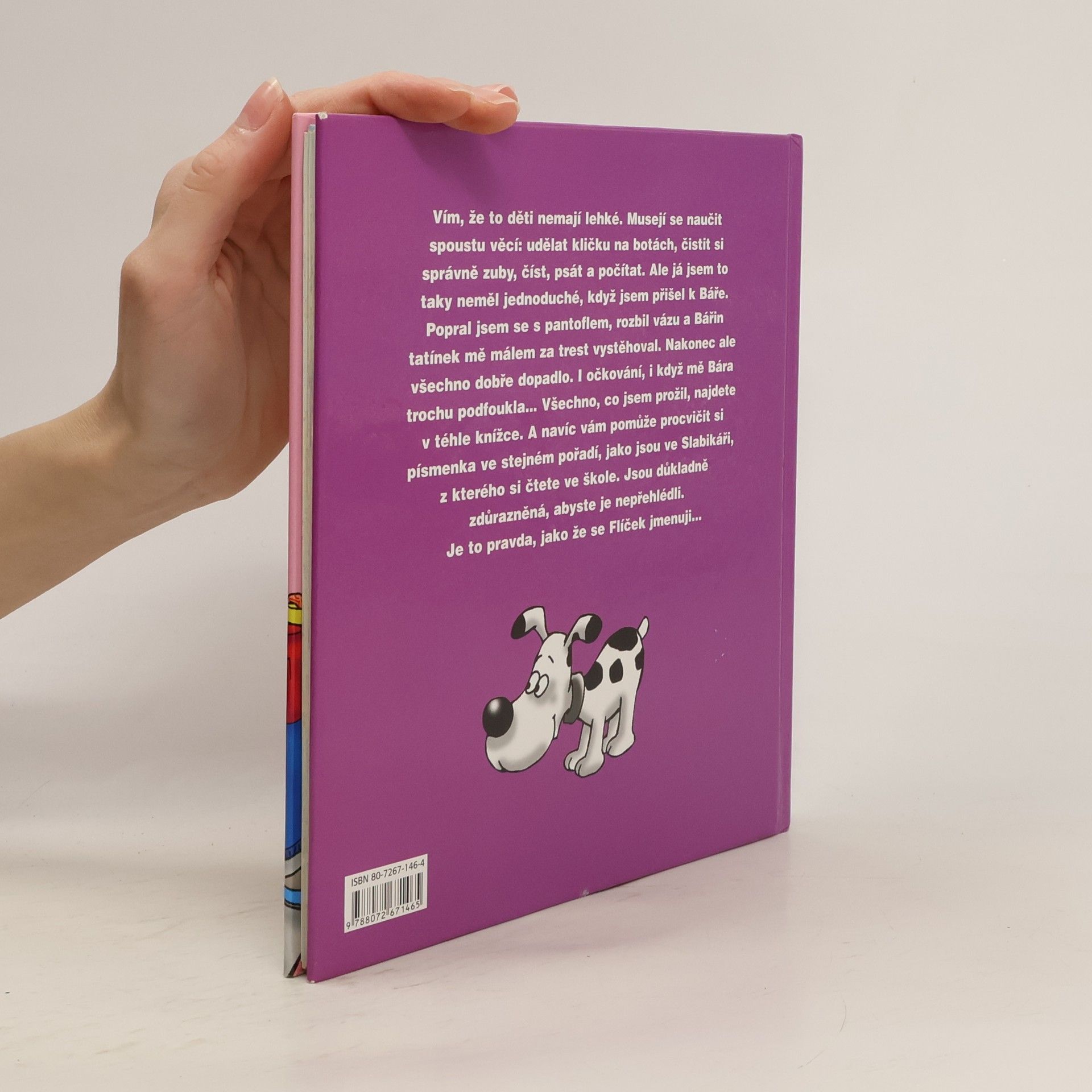 Vím, že to děti nemají lehké. Musejí se naučit spoustu věcí: udělat kličku na botách, čistit si správně zuby, číst, psát a počítat. Ale já jsem to taky neměl jednoduché, když jsem přišel k Báře. Popral jsem se s pantoflem, rozbil vázu a Bářin tatínek mě málem za trest vystěhoval. Nakonec ale všechno dobře dopadlo. I očkování, i když mě Bára trochu podfoukla... Všechno, co jsem prožil, najdete v téhle knížce. A navíc vám pomůže procvičit si písmenka ve stejném pořadí, jako jsou ve Slabikáři, z kterého si čtete ve škole. Jsou důkladně zdůrazněná, abyste je nepřehlédli. Je to pravda, jako že se Flíček jmenuji... Abeceda bez námahy aneb Můj pohádkový slabikář.