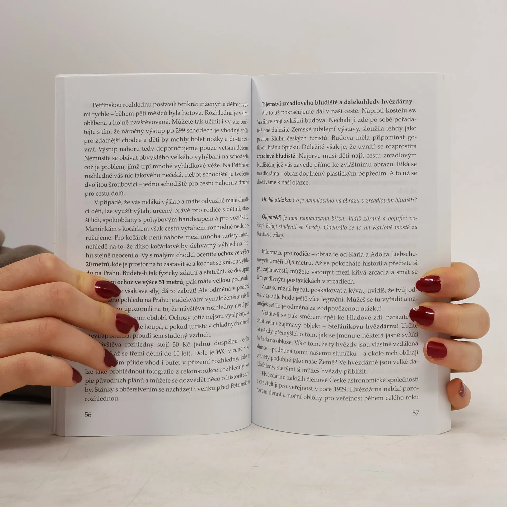 Neobvyklý turistický průvodce orientovaný na návštěvníky Prahy s malými dětmi. Je zaměřen velmi prakticky: řeší např. kde můžete děti bez problémů přebalit a nakojit, kde pro ně dostanete zdravé jídlo, kde najdete dětské koutky a hřiště apod. Zároveň se dívá na tradiční objekty turistického zájmu z dětské perspektivy. Rodičům nabízí poutavé příběhy, s jejichž pomocí mohou zvýšit zvědavost dítěte a jeho zájem o dané turisticky atraktivní místo. Návrhy jednotlivých tras jsou rozděleny podle stupňů obtížnosti pro různě velké děti (0–8 let) a nabízejí také různé alternativy podle zájmu dětí, počasí apod.