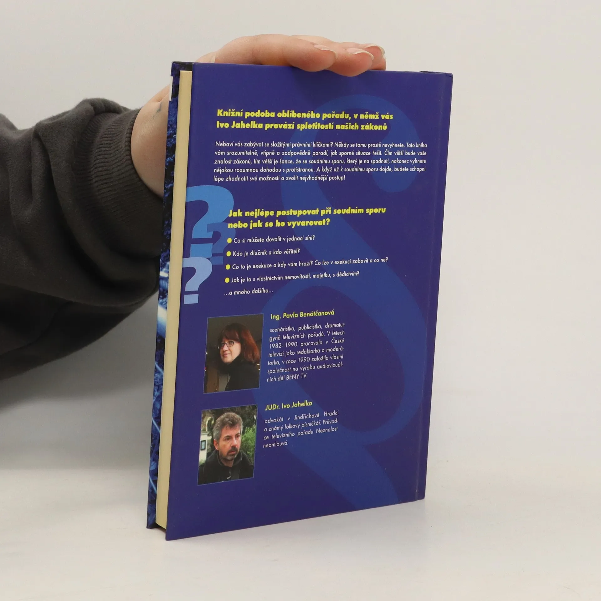 Knižní podoba oblíbeného pořadu, v němž vás Ivo Jahelka provází spletitostí našich zákonů. Nebaví vás zabývat se složitými právními kličkami? Knížka vám srozumitelně, vtipně a zodpovědně poradí, jak řešit sporné situace. Čím větší bude vaše znalost zákonů, tím větší ješance, že se soudnímu sporu, který je na spadnutí, nakonec vyhnete – nějakou rozumnou dohodou s protistranou. A když už k soudnímu sporu dojde, budete schopni lépe zhodnotit své možnosti a zvolit nejvhodnější postup!