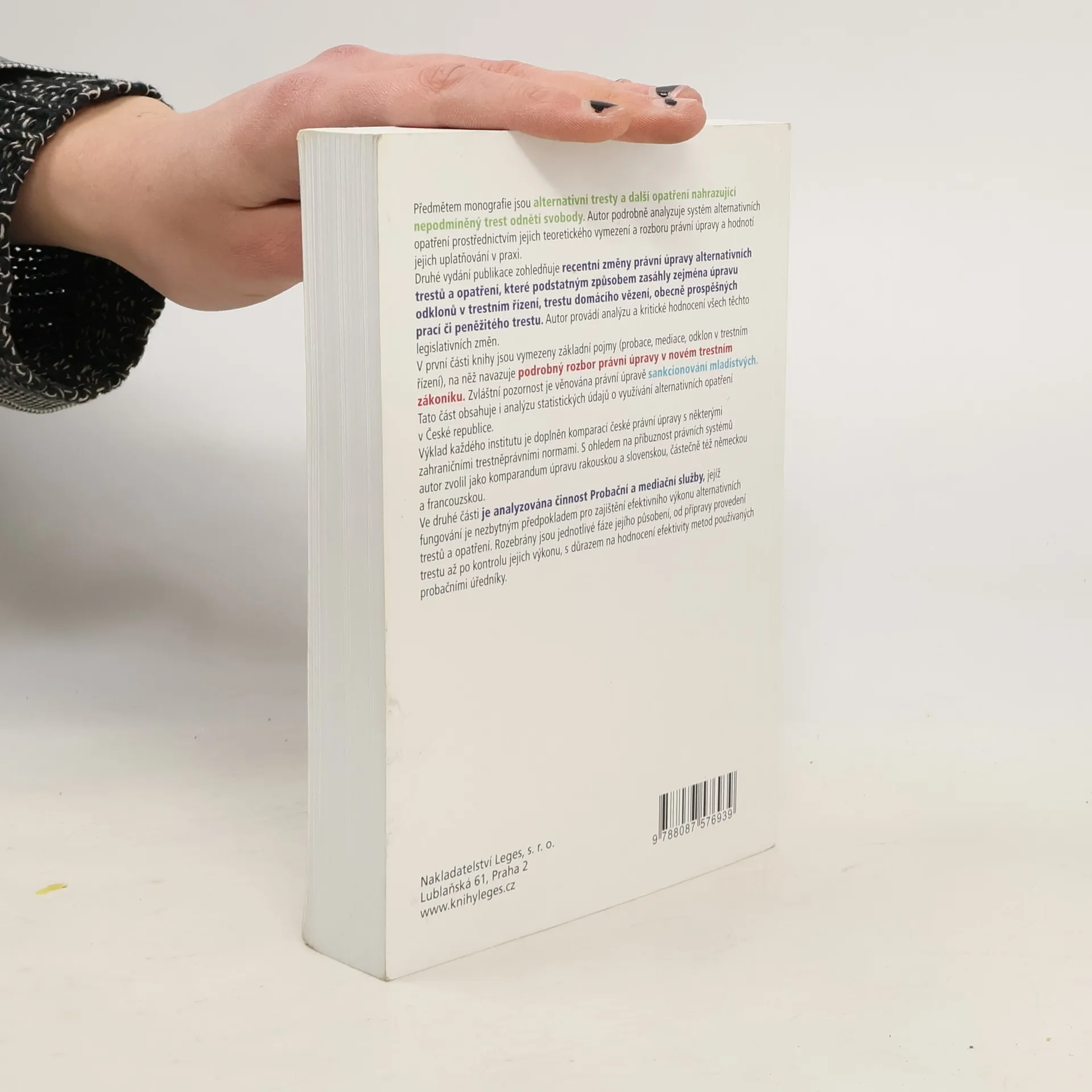 Monografie se zaměřuje na alternativní tresty a opatření nahrazující nepodmíněný trest odnětí svobody. Autor analyzuje systém alternativních opatření prostřednictvím teoretického vymezení a právního rozboru, hodnotí jejich praktické uplatnění. Druhé vydání reflektuje recentní změny právní úpravy, které zásadně ovlivnily úpravu odklonů v trestním řízení, domácí vězení, obecně prospěšné práce a peněžité tresty. Autor kriticky hodnotí legislativní změny a v první části knihy vymezuje základní pojmy jako probace a mediace, následované podrobným rozborem právní úpravy v novém trestním zákoníku, se zvláštní pozorností věnovanou sankcionování mladistvých. Tato část zahrnuje analýzu statistických údajů o využívání alternativních opatření v ČR a komparaci české právní úpravy s rakouskými, slovenskými, německými a francouzskými normami. Druhá část se soustředí na činnost Probační a mediační služby, která je klíčová pro efektivní výkon alternativních trestů. Rozebrány jsou jednotlivé fáze jejího působení, od přípravy provedení trestu po kontrolu výkonu, s důrazem na hodnocení efektivity metod používaných probačními úředníky.
