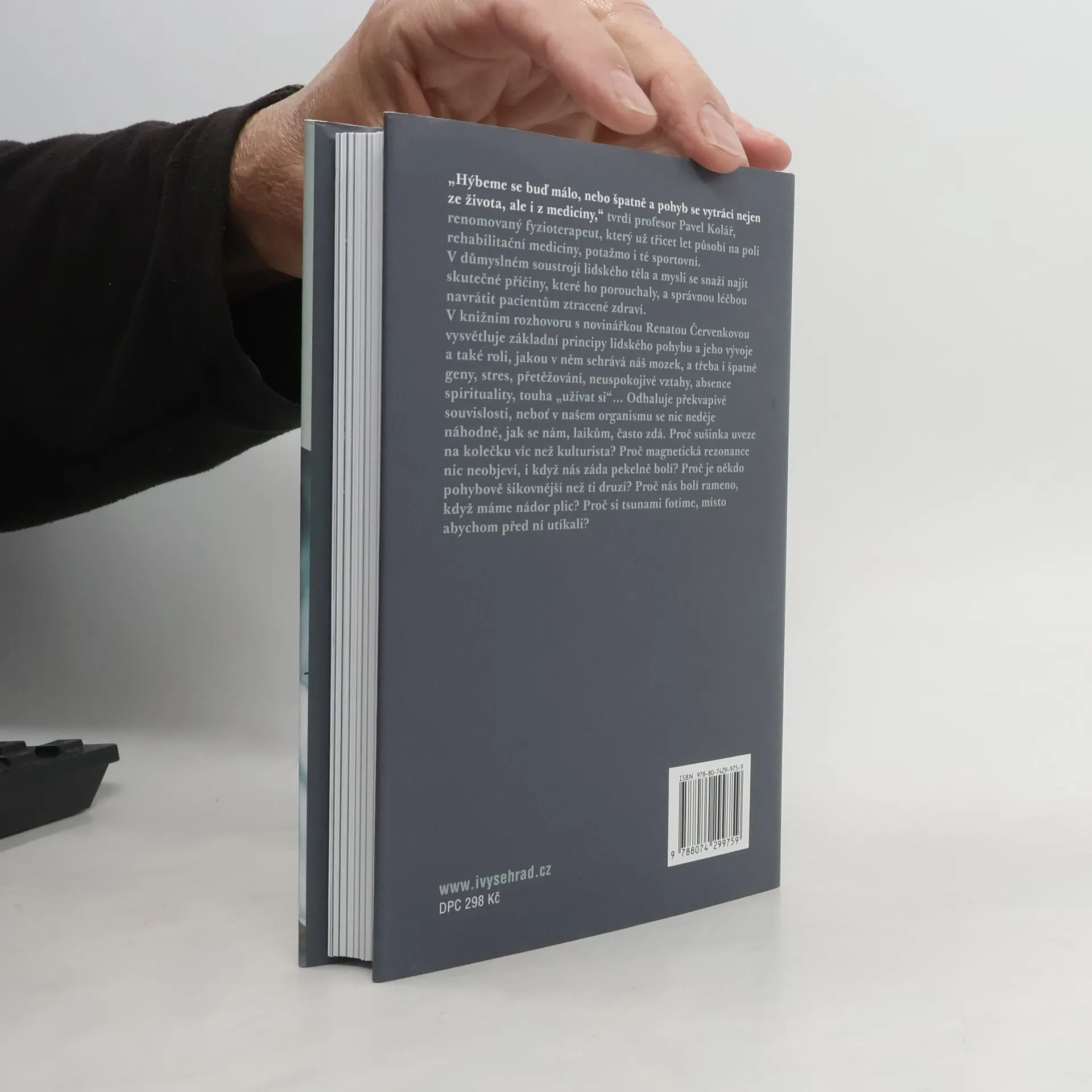 Knižní rozhovor s renomovaným fyzioterapeutem prof. Kolářem. „Hýbeme se buď málo, nebo špatně a pohyb se vytrácí nejen ze života, ale i z medicíny,“ tvrdí profesor Pavel Kolář, renomovaný fyzioterapeut, který už třicet let působí na poli rehabilitační medicíny, potažmo i té sportovní. V důmyslném soustrojí lidského těla a mysli se snaží najít skutečné příčiny, které ho porouchaly, a správnou léčbou navrátit pacientům ztracené zdraví. V rozhovorech s novinářkou Renátou Červenkovou vysvětluje základní principy lidského pohybu a jeho vývoje a také roli, jakou v něm sehrává náš mozek a třeba i špatné geny, stres, přetěžování, neuspokojivé vztahy, absence spirituality, touha „užívat si“... Odhaluje překvapivé souvislosti, neboť v našem organismu se nic neděje náhodně, jak se nám, laikům, často zdá. Proč nás bolí rameno, když máme nádor plic? Proč sušinka uveze na kolečku víc než kulturista? Proč magnetická rezonance nic neobjeví, i když nás záda pekelně bolí? Proč je někdo pohybově šikovnější než ti druzí? Proč si tsunami fotíme, místo abychom před ní utíkali?