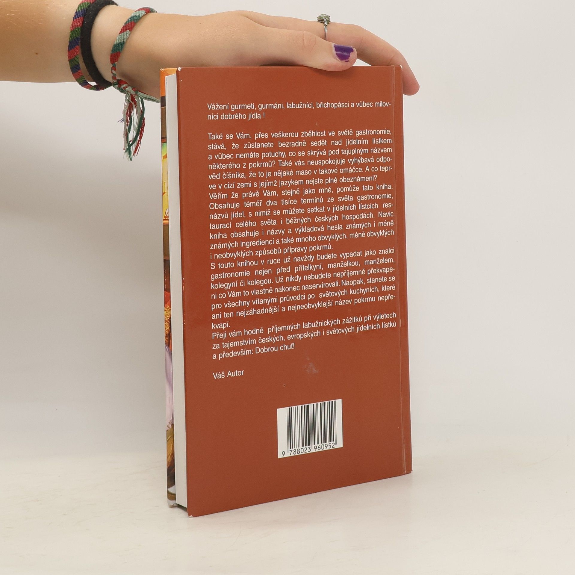 Také. se Vám, přes veškerou zběhlost ve světě gastronomie, stává, že zůstanete bezradně sedět nad jídelním lístkem a vůbec nemáte potuchy, co se skrývá pod tajuplným názvem některého z pokrmů? Autor věří že právě Vám pomůže tato kniha. Obsahuje téměř dva tisíce termínů ze světa gastronomie, názvů jídel, s nimiž se můžete setkat v jídelních lístcích restaurací celého světa i běžných českých hospodách. Navíc kniha obsahuje i názvy a výkladová hesla známých i méně známých ingrediencí a také mnoho obvyklých, méně obvyklých i neobvyklých způsobů přípravy pokrmů. S touto knihou v ruce už navždy budete vypadat jako znalci gastronomie nejen před přítelkyní, manželkou, manželem, kolegyní či kolegou. Už nikdy nebudete nepříjemně překvapeni co Vám to vlastně nakonec naservírovali. Naopak, stanete se pro všechny vítanými průvodci po světových kuchyních, které ani ten nejzáhadnější a nejneobvyklejší název pokrmu nepřekvapí. Přeji vám hodně příjemných labužnických zážitků při výletech za tajemstvím českých, evropských i světových jídelních lístků a především: Dobrou chuť!
