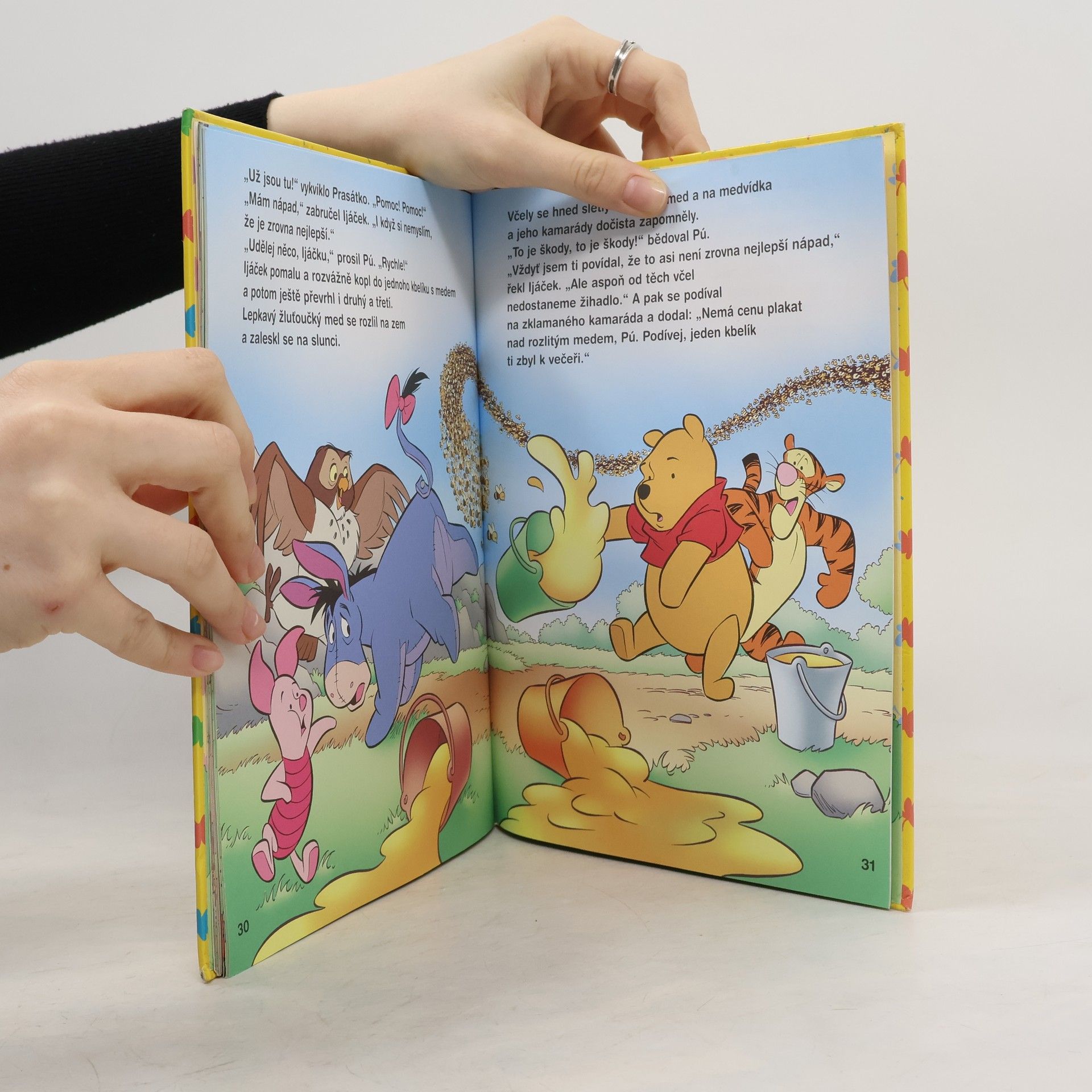Medvídek Pú vstal z postele, promnul si oči a rozhrnul závěsy. „Už je ráno !“ řekl si spokojeně. „A protože je ráno, je také čas k snídani.“ Dal si vařit v konvici vodu na čaj a zasnil se, jak je krásné být medvídkem, když tu si vzpomněl, že mu k snídani chybí jedna moc důležitá věc.