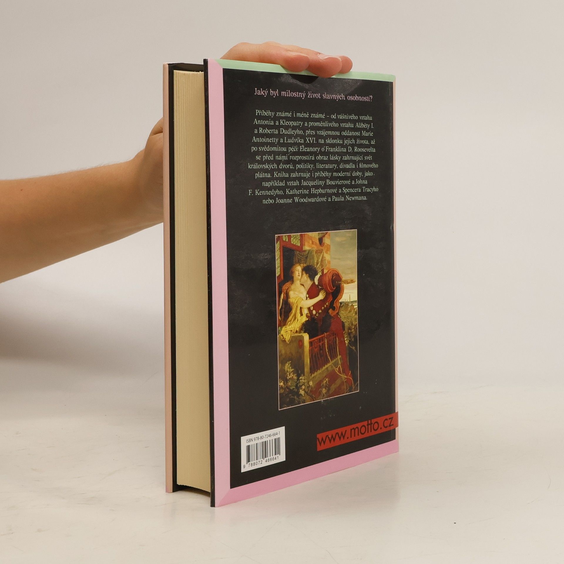 Příběhy známé i méně známé – od vášnivého vztahu Antonia a Kleopatry a proměnlivého vztahu Alžběty I. a Roberta Dudleyho, přes vzájemnou oddanost Marie Antoinetty a Ludvíka XVI. na sklonku jejich života, až po svědomitou péči Eleanory o Franklina D. Roosevelta se před námi rozprostírá obraz lásky zahrnující svět královských dvorů, politiky, literatury, divadla i filmového plátna. Kniha zahrnuje i příběhy moderní doby, jako například vztah Jacqueliny Bouvierové a Johna F. Kennedyho.