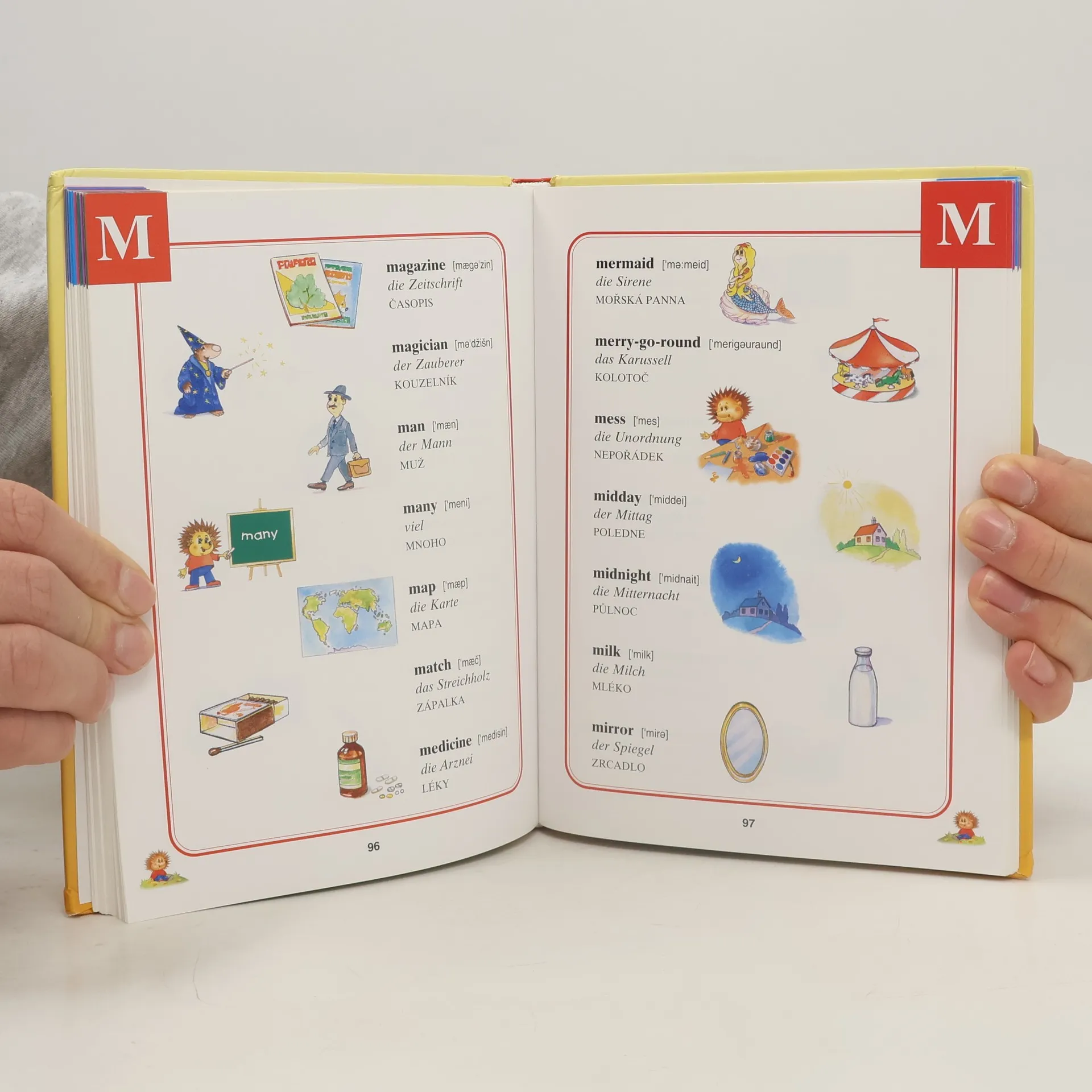 Ilustrovaný slovník zábavnou a přitažlivou formou přibližuje dětem anglický a německý jazyk a podněcuje jejich chuť k poznání cizích jazyků. Výrazy ve slovníku – barvy, dny v týdnu, měsíce, roční období, čísla nebo členy rodiny - jsou řazené podle anglické abecedy.
