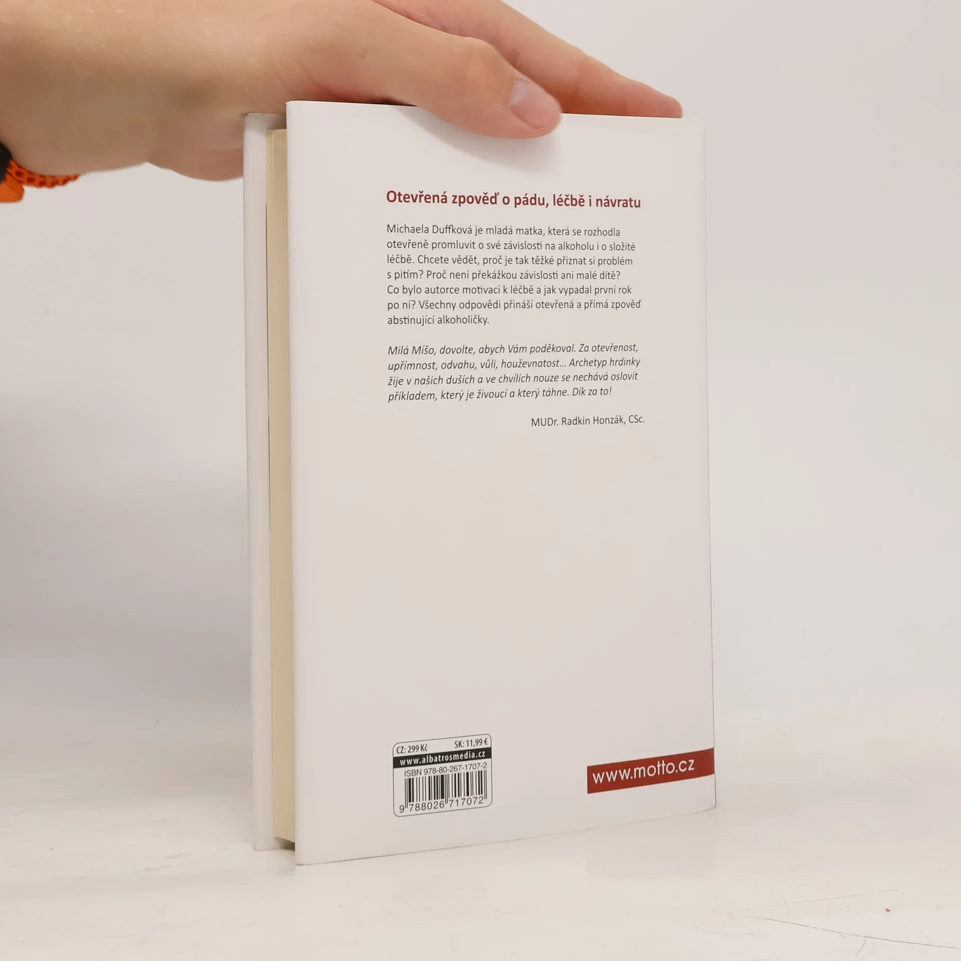 Poslední sklenička… dnes už popáté. Kniha podle blogu, který získal cenu Magnesia Litera. Michaela Duffková je mladá matka, která se rozhodla otevřeně promluvit o své závislosti na alkoholu i o složité léčbě. Chcete vědět, proč je tak těžké přiznat si problém s pitím? Proč není překážkou závislosti ani malé dítě? Co bylo autorce motivací k léčbě a jak vypadal první rok po ní? Všechny odpovědi přináší otevřená a přímá zpověď abstinující alkoholičky. Upřímně sdílená zkušenost o pádu doslova na dno vzbudila velký zájem veřejnosti, Michaela získala za svůj blog cenu Magnesia Litera a začala o závislosti veřejně přednášet. Dnes se věnuje svému vysněnému projektu – centru pro prevenci a léčbu závislosti na alkoholu. „Příběh Míši Duffkové je skvělým příspěvkem k destigmatizaci ženského alkoholismu a současně unikátní výpovědí o bolesti i naději.“ prof. PhDr. Michal Miovský, Ph.D. přednosta Kliniky adiktologie 1. LF UK a VFN