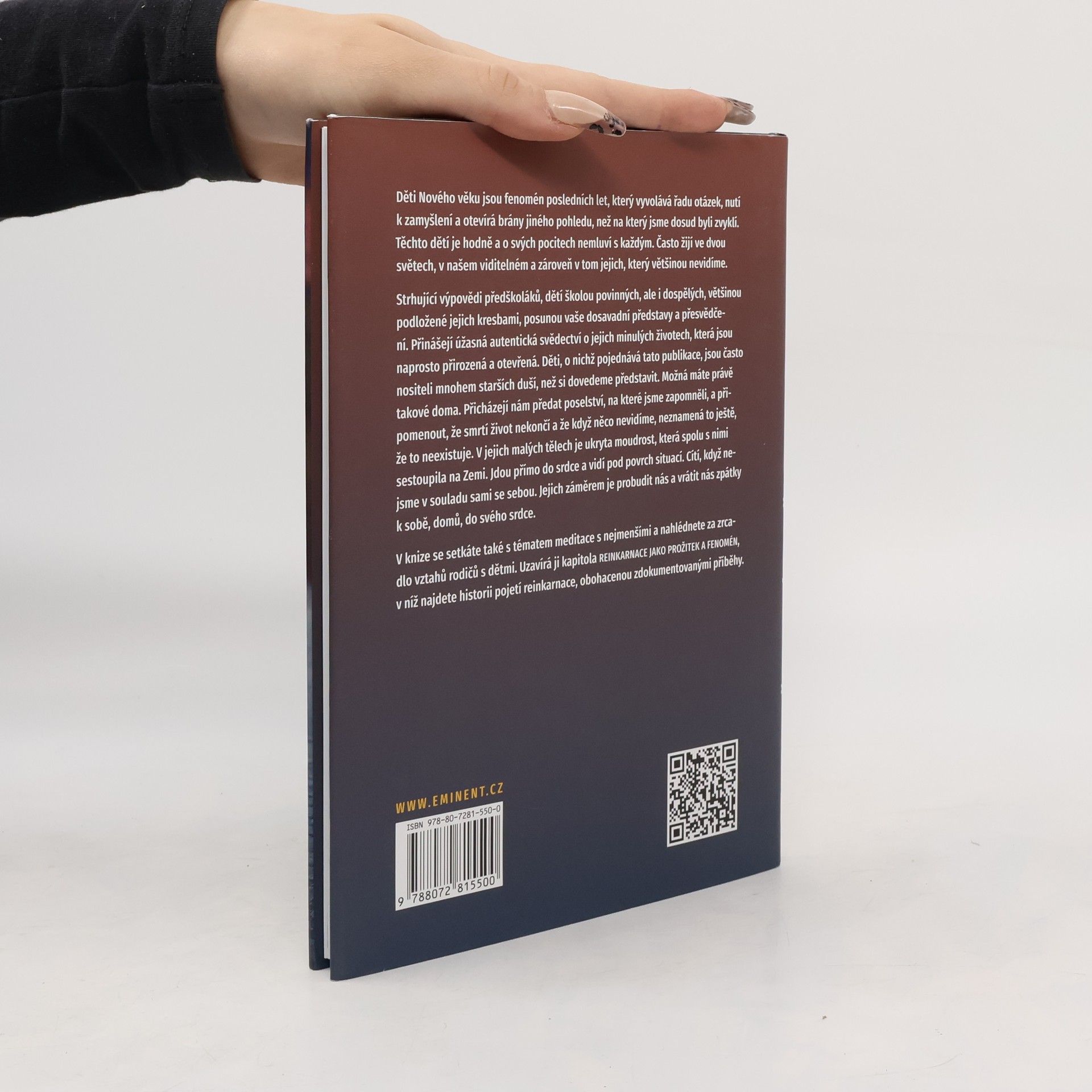 Děti Nového věku jsou fenomén posledních let, který vyvolává řadu otázek, nutí k zamyšlení a otevírá brány jiného pohledu, než na který jsme dosud byli zvyklí. Těchto dětí je hodně a o svých pocitech nemluví s každým. Často žijí ve dvou světech, v našem viditelném a zároveň v tom jejich, který většinou nevidíme. Strhující výpovědi předškoláků, dětí školou povinných, ale i dospělých, většinou podložené jejich kresbami, posunou vaše dosavadní představy a přesvědčení. Přinášejí úžasná autentická svědectví o jejich minulých životech, která jsou naprosto přirozená a otevřená. Děti, o nichž pojednává tato publikace, jsou často nositeli mnohem starších duší, než si dovedeme představit. Možná máte právě takové doma. Přicházejí nám předat poselství, na které jsme zapomněli, a připomenout, že smrtí život nekončí a že když něco nevidíme, neznamená to ještě, že to neexistuje. V jejich malých tělech je ukryta moudrost, která spolu s nimi sestoupila na Zemi. Jdou přímo do srdce a vidí pod povrch situací. Cítí, když nejsme v souladu sami se sebou. Jejich záměrem je probudit nás a vrátit nás zpátky k sobě, domů, do svého srdce. V knize se setkáte také s tématem meditace s nejmenšími a nahlédnete za zrcadlo vztahů rodičů s dětmi. Uzavírá ji kapitola Reinkarnace jako prožitek a fenomén, v níž najdete historii pojetí reinkarnace, obohacenou zdokumentovanými příběhy.