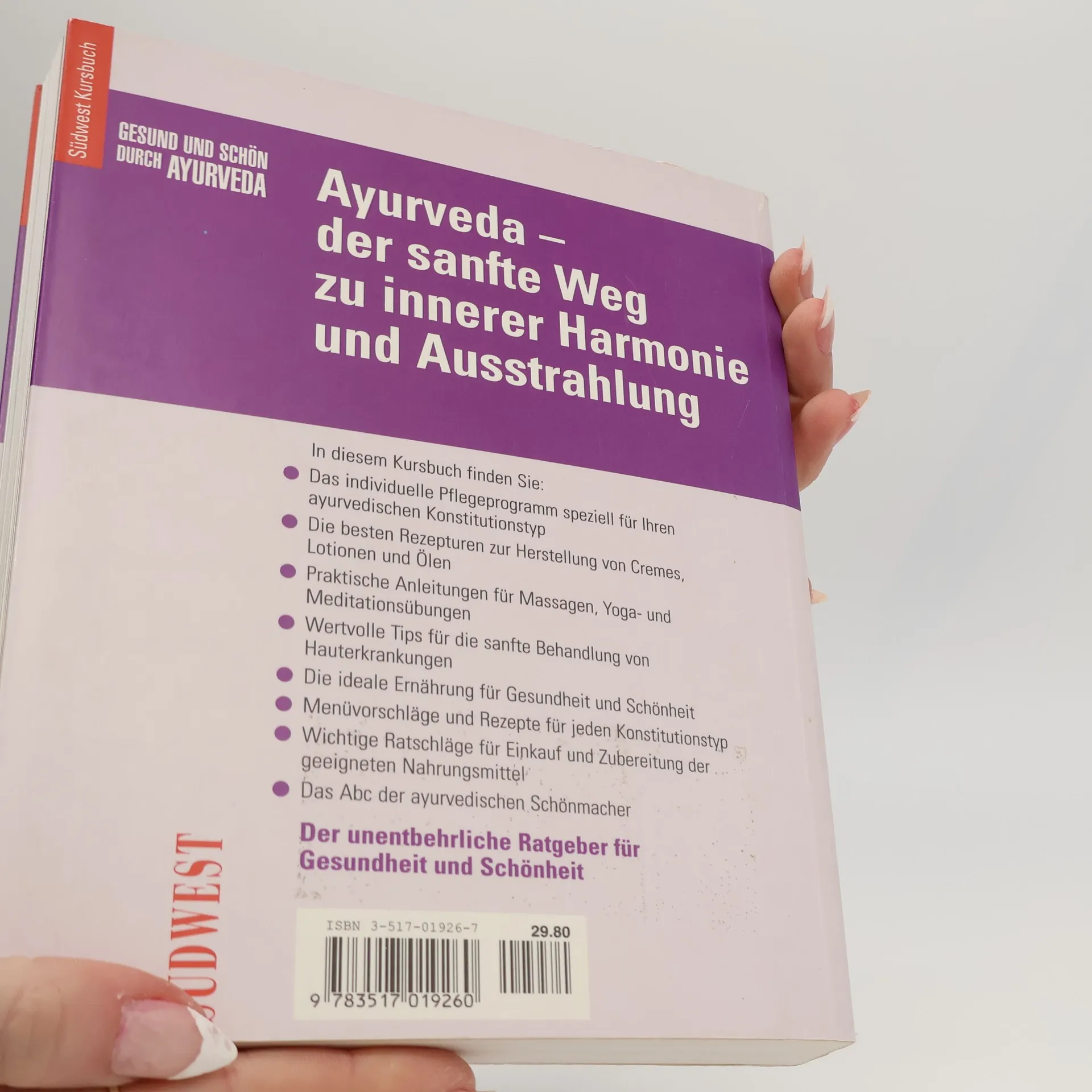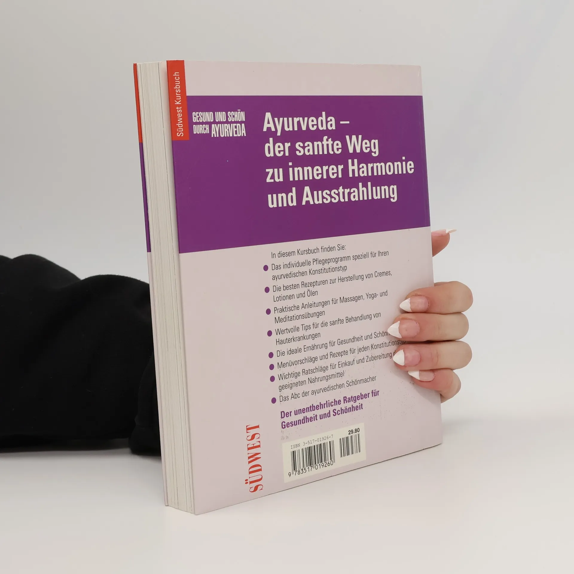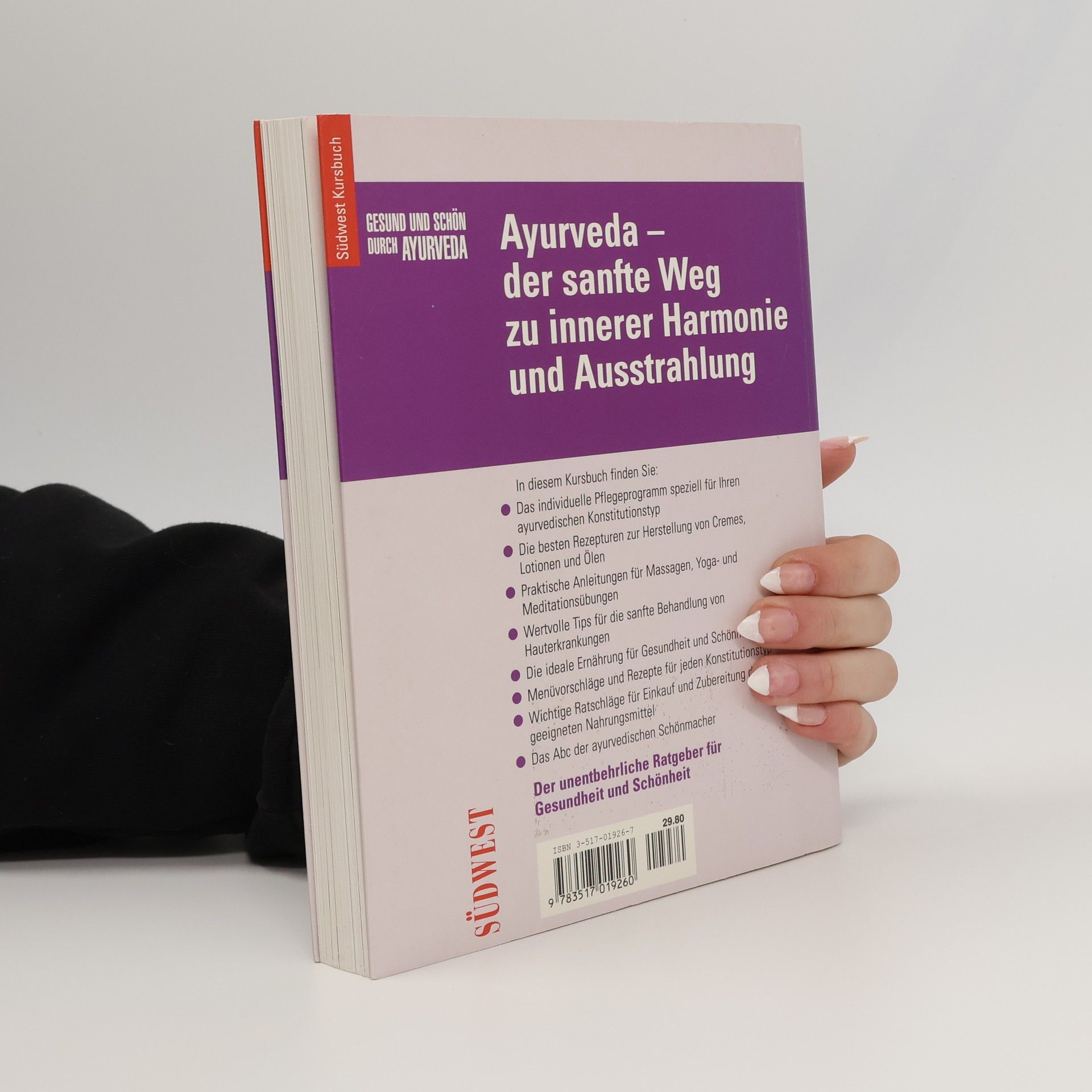 Die indische Gesundheitslehre Ayurveda zieht immer mehr Menschen in ihren Bann. Dieses Kursbuch führt in die Vielfalt ihrer Anwendungsmöglichkeiten ein. Es gibt wertvolle Anregungen und Tipps zur Erhaltung der Gesundheit und Schönheit. Mit Anleitungen zu Massagen, Entspannungsübungen und zur eigenen Herstellung von Ölen, Salben und Cremes. Die indische Gesundheitslehre Ayurveda zieht immer mehr Menschen in ihren Bann. Dieses Kursbuch führt in die Vielfalt ihrer Anwendungsmöglichkeiten ein. Es gibt wertvolle Anregungen und Tipps zur Erhaltung der Gesundheit und Schönheit. Mit Anleitungen zu Massagen, Entspannungsübungen und zur eigenen Herstellung von Ölen, Salben und Cremes.