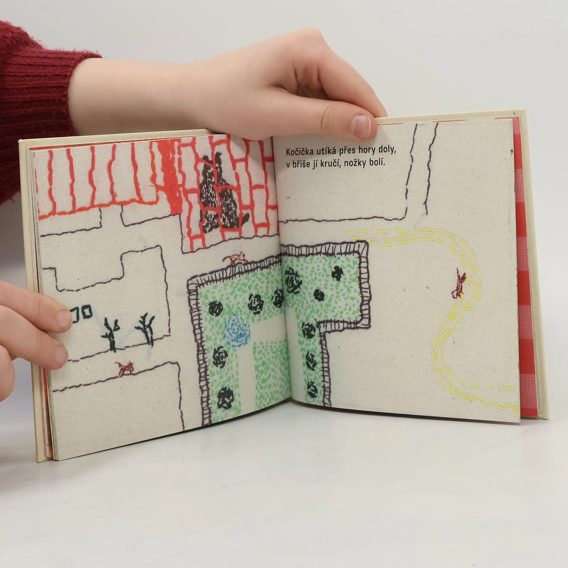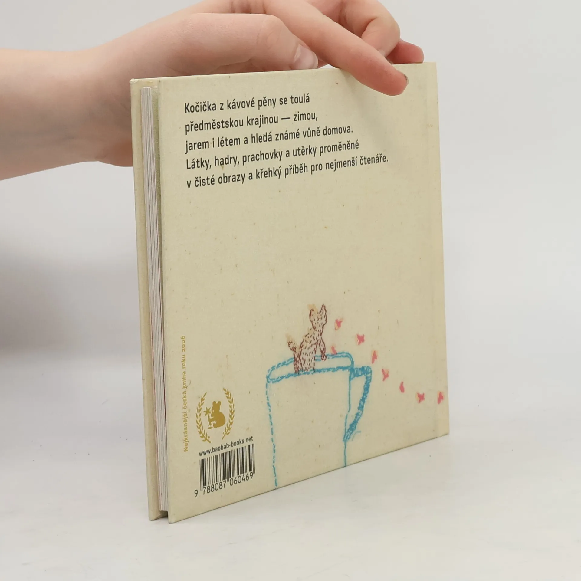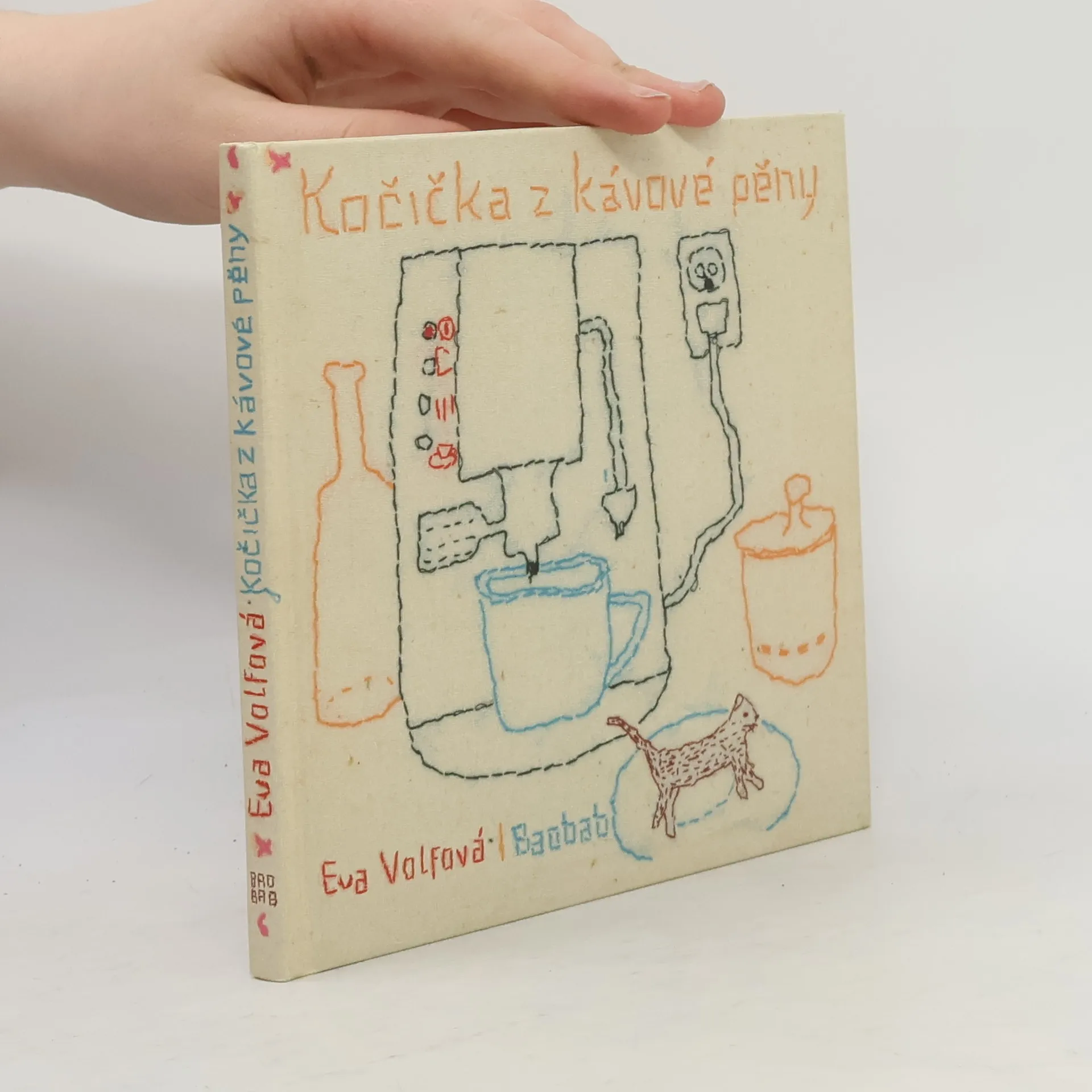 Kočička z kávové pěny se toulá předměstskou krajinou - zimou, jarem i létem a hledá známé vůně domova. Eva Volfová proměnila látky, hadry, prachovky a utěrky v čisté obrazy a křehký příběh pro nejmenší čtenáře. Ilustrace textem doprovodila Tereza Horváthová. Tato obrazová pohádka vypráví o kočičce zrozené z teplé kávy a nadýchané pěny, kterou její nevědomí stvořitelé vyhnali z domu... Jednotlivé obrazy jsou vyšity barevnými nitěmi na starých látkách. V tomto svérázném fiktivním obrazovém prostředí ve stylu arte povera je pak zasazen jednoduchý a krátký doprovodný text. Barevnost jednotlivých použitých materiálů podtrhuje gradaci děje s jeho klidnějšími i dynamičtějšími částmi, nepřesné "tahy" nití vykreslujících scénu a její subjekty jsou zkratkovité a naivitou simulují dětskou ruku.