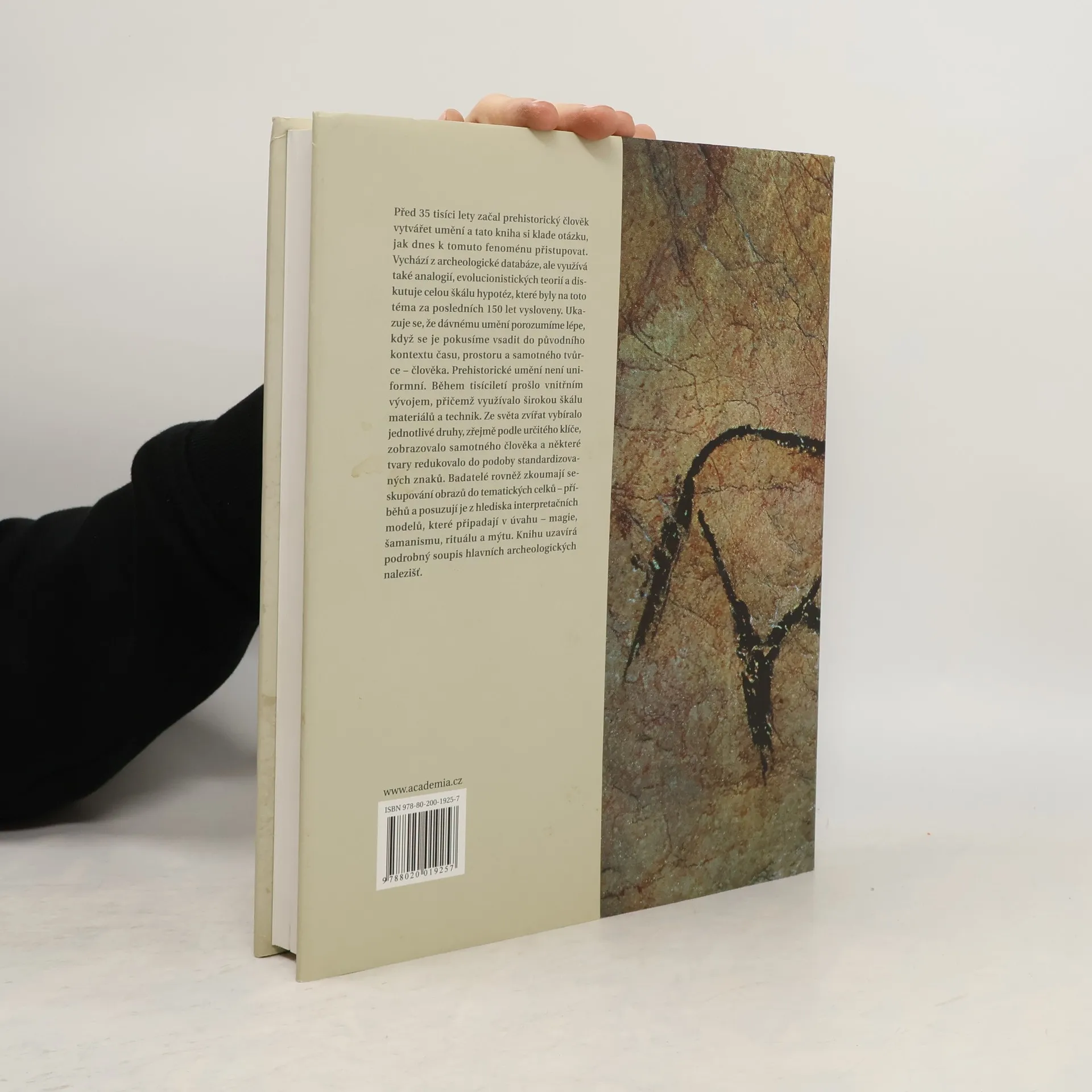 Před 35 tisíci lety začal prehistorický člověk vytvářet umění a tato kniha si klade otázku, jak dnes k tomuto fenoménu přistupovat. Vychází z archeologické databáze, ale využívá také analogií, evolucionistických teorií a diskutuje celou škálu hypotéz, které byly na toto téma za posledních 150 let vysloveny. Ukazuje se, že dávnému umění porozumíme lépe, když se je pokusíme vsadit do původního kontextu času, prostoru a samotného tvůrce – člověka. Prehistorické umění není uniformní. Během tisíciletí prošlo vnitřním vývojem, přičemž využívalo širokou škálu materiálů a technik. Ze světa zvířat vybíralo jednotlivé druhy, zřejmě podle určitého klíče, zobrazovalo samotného člověka a některé tvary redukovalo do podoby standardizovaných znaků. Badatelé rovněž zkoumají seskupování obrazů do tematických celků – příběhů a posuzují je z hlediska interpretačních modelů, které připadají v úvahu – magie, šamanismu, rituálu a mýtu. Fotografie Martin Frouz, Jiří A. Svoboda a Jean Clottes.